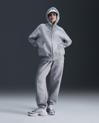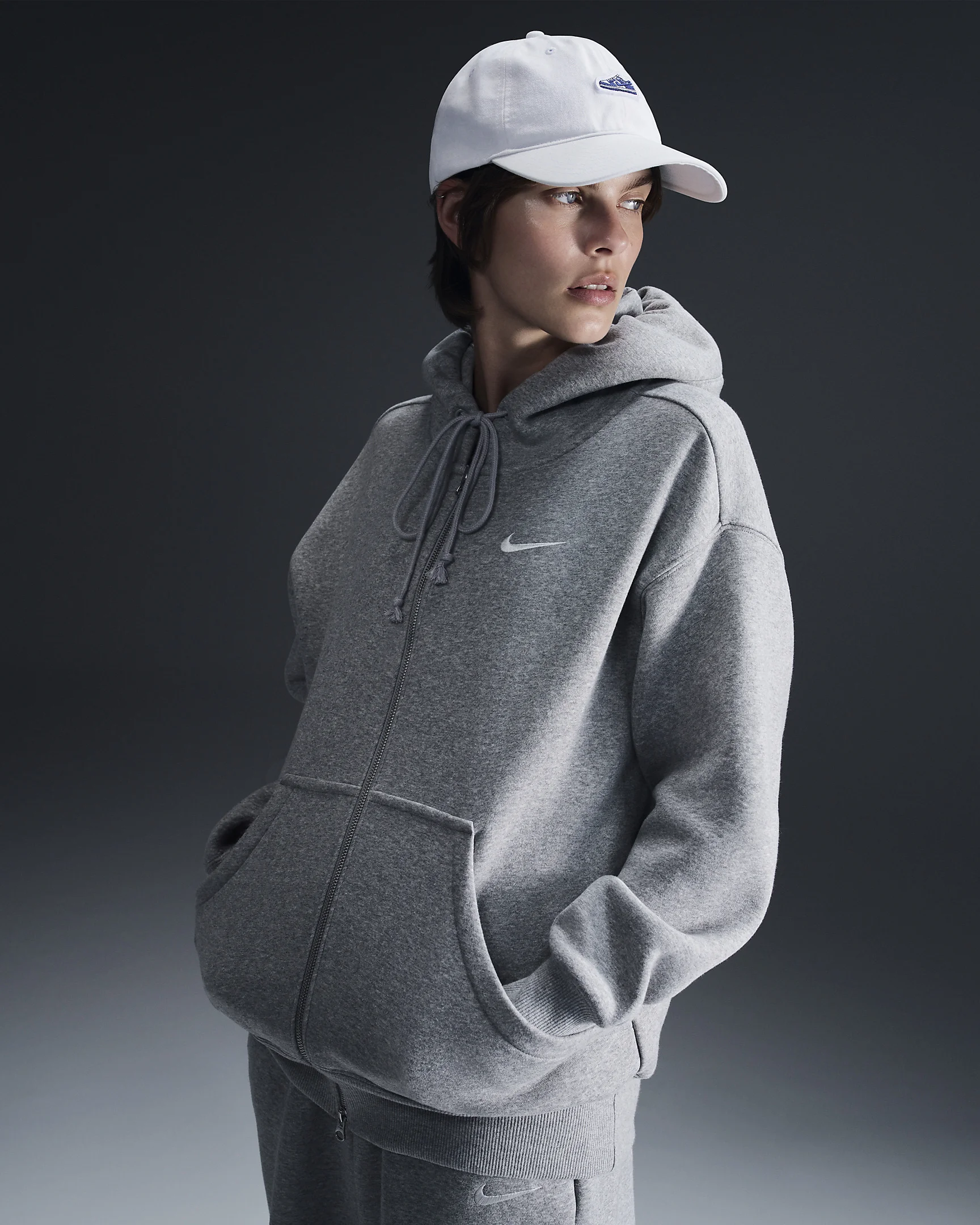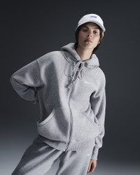 Grounded in style, comfort and versatility, meet our take on luxury loungewear. This zip-up hoodie helps you stay cozy all day long, thanks to midweight fleece that feels soft yet structured. Plus, exaggerated details (like the oversized pocket and taller ribbing) give you a trend-right look. Benefits - Our midweight brushed fleece feels extra soft on the inside and smooth on the outside, helping you stay cozy while keeping its structured shape. - Dropped shoulder seams and oversized fit provide a casual, relaxed look. Product Details - Full zipper - Drawcord hood - Elongated ribbing - Embroidered Swoosh logo - Body: 80% cotton/20% polyester. Hood lining: 100% cotton. - Machine wash - Imported - Shown: Dark Grey Heather/Sail - Style: DQ5758-063 SIZE & FIT Model is wearing size S and is 5′9″175cm Oversized fit: exaggerated and spacious Fits large; we recommend ordering a size down
