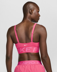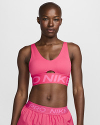Show up and show off in this bold plunging sports bra. Minimized coverage still delivers a snug hold that helps keep everything in place, so you can keep pushing yourself. Plus, convertible straps and removable pads give you the freedom to style it your way. Product Details - Jacquard elastic chest band - Body: 72% polyester/28% spandex. Bottom hem: 70% polyester/18% spandex/12% nylon. Straps: 79% nylon/21% spandex. Lining: 88% polyester/12% spandex. Pad top fabric: 100% polyester. Pad: 100% polyurethane. Pad back fabric: 100% polyester. - Machine wash - Imported - Shown: Aster Pink/Pinksicle/White - Style: HF7324-629 SIZE & FIT Model is wearing size S Model height: 5′8″173cm Model bust: 33″84cm Tight fit: snug and form-fitting Medium support: feels ke a snug hold to keep everything in place