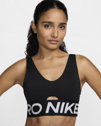 Show up and show off in this bold plunging sports bra. Minimized coverage still delivers a snug hold that helps keep everything in place, so you can keep pushing yourself. Plus, convertible straps and removable pads give you the freedom to style it your way. Product Details - Jacquard elastic chest band - Body: 72% polyester/28% spandex. Bottom hem: 70% polyester/18% spandex/12% nylon. Straps: 79% nylon/21% spandex. Lining: 88% polyester/12% spandex. Pad top fabric: 100% polyester. Pad: 100% polyurethane. Pad back fabric: 100% polyester. - Machine wash - Imported - Shown: Black/White/White - Style: HF7324-010 SIZE & FIT Model is wearing size S Model height: 5′9″175cm Model bust: 32″81cm Tight fit: snug and form-fitting Medium support: feels ke a snug hold to keep everything in place