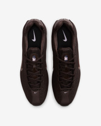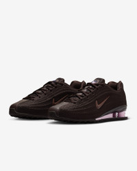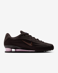 Your favorite retro runner has reached its next evolution. The Shox Z has a slim, low-profile shape and a new take on the iconic column design. Benefits - Textile upper is light and breathable, and synthetic leather accents channel original Shox style. - Nike Shox columns provide resilient cushioning. - Modified, circular Waffle outsole gives you durable traction. Product Details - Shiny finishes - Foam midsole - Rubber outsole - Shown: Velvet Brown/Black/Pink Foam/Light Chocolate - Style: HQ7540-200
