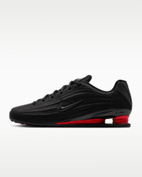 Your favorite retro runner has reached its next evolution. The Shox Z has a slim, low-profile shape and a new take on the iconic column design. Benefits - Textile upper is light and breathable, and synthetic leather accents channel original Shox style. - Nike Shox columns provide resilient cushioning. - Modified, circular Waffle outsole gives you durable traction. Product Details - Shiny finishes - Foam midsole - Rubber outsole - Shown: Black/University Red/Black - Style: HQ7540-002