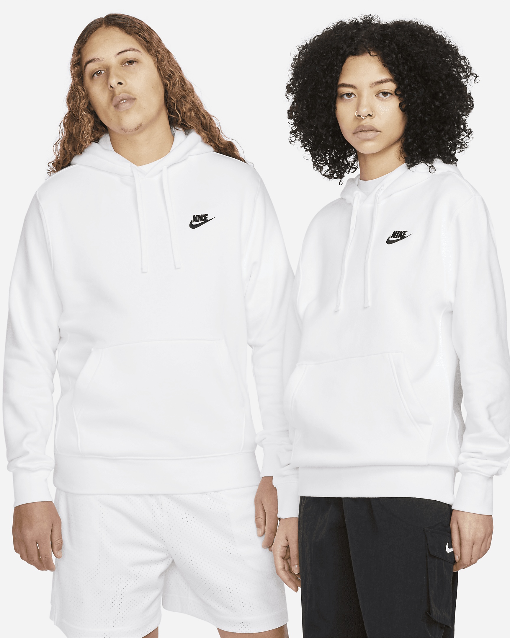 A closet staple, the Nike Sportswear Club Fleece Pullover Hoodie combines classic style with the soft comfort of fleece. Product Details - Standard fit for a relaxed, easy feel - Ribbed hem and cuffs - Kangaroo pocket - Fabric: Body: 80-82% cotton/18-20% polyester. Hood lining: 100% cotton. - Machine wash - Imported - Note: Material percentages may vary depending on factory. Check label for actual content. - Shown: White/White/Black - Style: BV2654-100 SIZE & FIT Model is wearing size M and is 6'2"188cm Big & Tall model is wearing size 2XL and is 6'3"191cm Standard fit: easy and traditional If you typically wear men's styles, please select your usual size. If you typically wear women's styles, please size down.