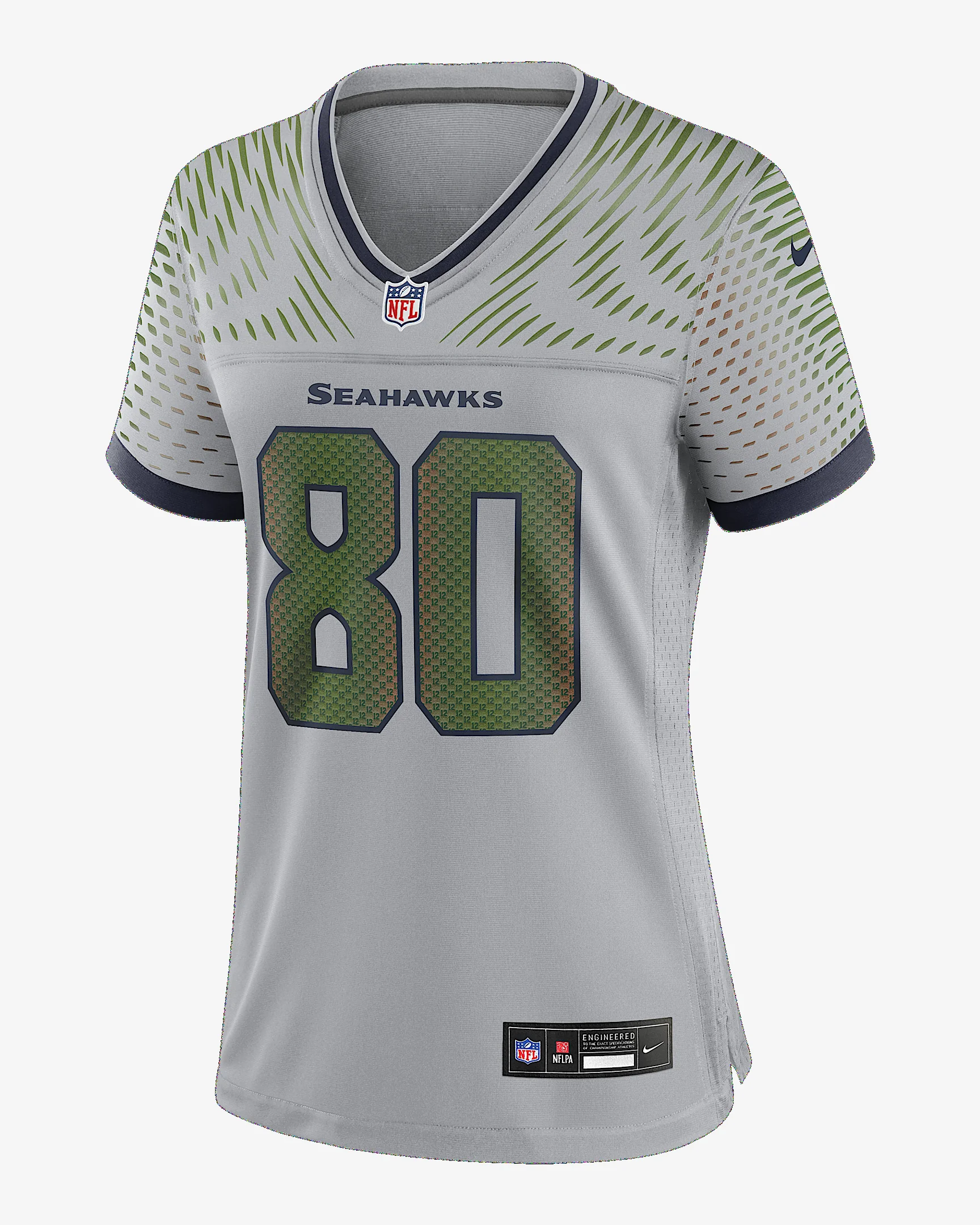 This Steve Largent Rivalries Collection Jersey is inspired by the 137.6 decibels that destroy hopes, dreams and eardrums. The authentic look represents the Northwest noise levels that send opponents’ seasons south and the Seattle Seahawks soaring. Breathable mesh panels and a form fit help provide a dry, comfortable feel that's ideal for game days. Benefits - Screen-printed name, number and team mark offer lightweight durability. - Ventilation over major heat zones helps keep you cool. Product Details - Standard fit for a relaxed, easy feel - NFL shield at V-neck - Tagless neck label - Woven jock tag - Shown: Grey - Style: 67NW0G5YW6Q-5M2