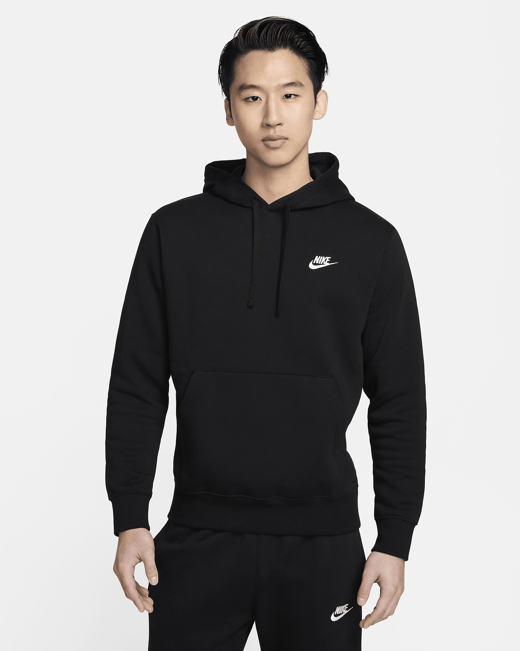 A closet staple, the Nike Sportswear Club Fleece Pullover Hoodie combines classic style with the soft comfort of fleece. Product Details - Standard fit for a relaxed, easy feel - Ribbed hem and cuffs - Kangaroo pocket - Fabric: Body: 80-82% cotton/18-20% polyester. Hood lining: 100% cotton. - Machine wash - Imported - Note: Material percentages may vary depending on factory. Check label for actual content. - Shown: Black/Black/White - Style: BV2654-010 SIZE & FIT Model is wearing size M and is 5'8"173cm Big & Tall model is wearing size 2XL and is 6'3"191cm Standard fit: easy and traditional If you typically wear men's styles, please select your usual size. If you typically wear women's styles, please size down.