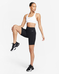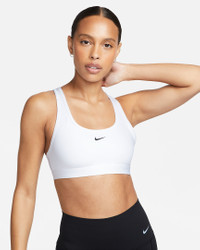 Find the perfect balance of coverage and comfort in this non-padded Swoosh sports bra. Light support gives you a gentle hold with plenty of freedom that's great for low-impact workouts or all-day comfort. Sweat-wicking, adaptive material quickly recovers its shape so you can stay comfortable. And when it's time to change, a minimal silhouette with widened armholes makes getting in and out of your bra a breeze. Product Details - Body: 82% polyester/18% spandex. Lining: 82% polyester/18% spandex. - Machine wash - Imported - Shown: White/Black - Style: DX6817-100 SIZE & FIT Tight fit: snug and form-fitting Light support: feels ke a soft hug with plenty of freedom
