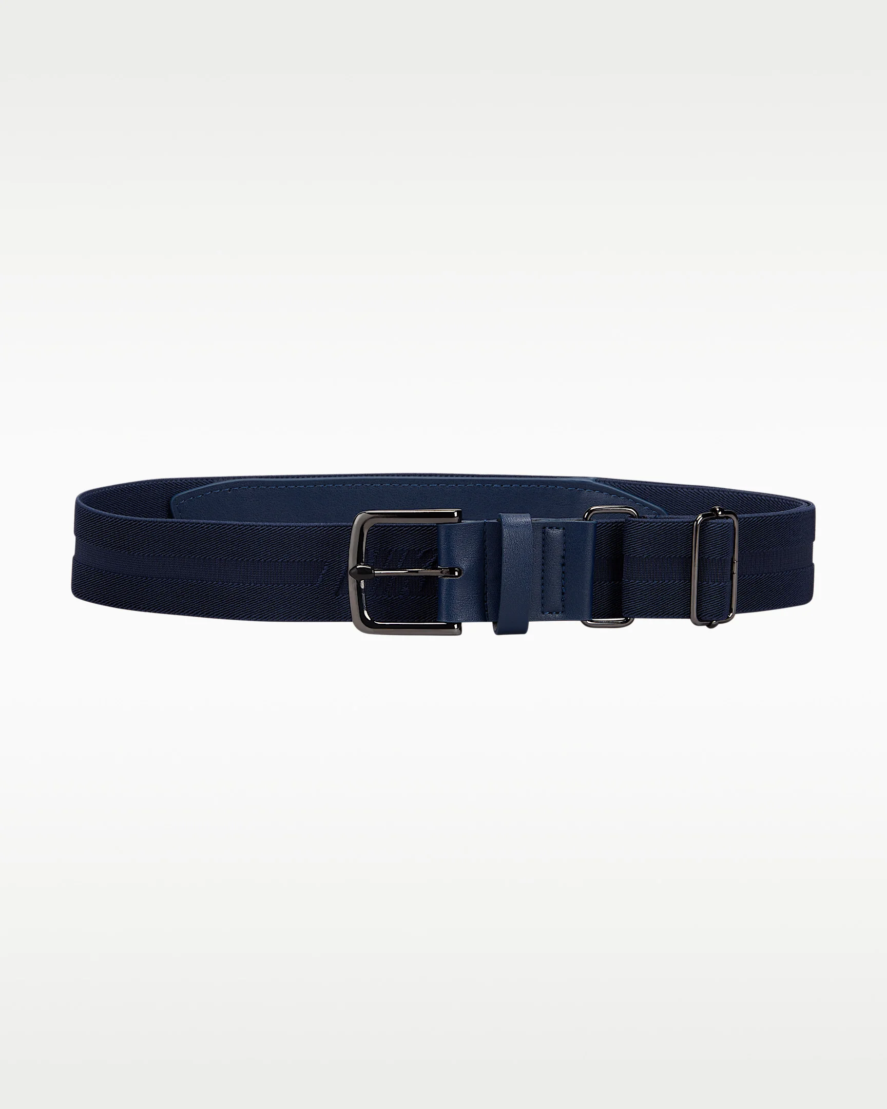 Designed for the diamond, this baseball belt is made of heavy, durable elastic and synthetic leather for a stretchy, customizable fit. Product Details - Fits waists 28" to 43" - 34% elastic/31% polyester/22% zinc alloy/13% polyurethane - Imported - Shown: Midnight Navy - Style: N1000732-401
