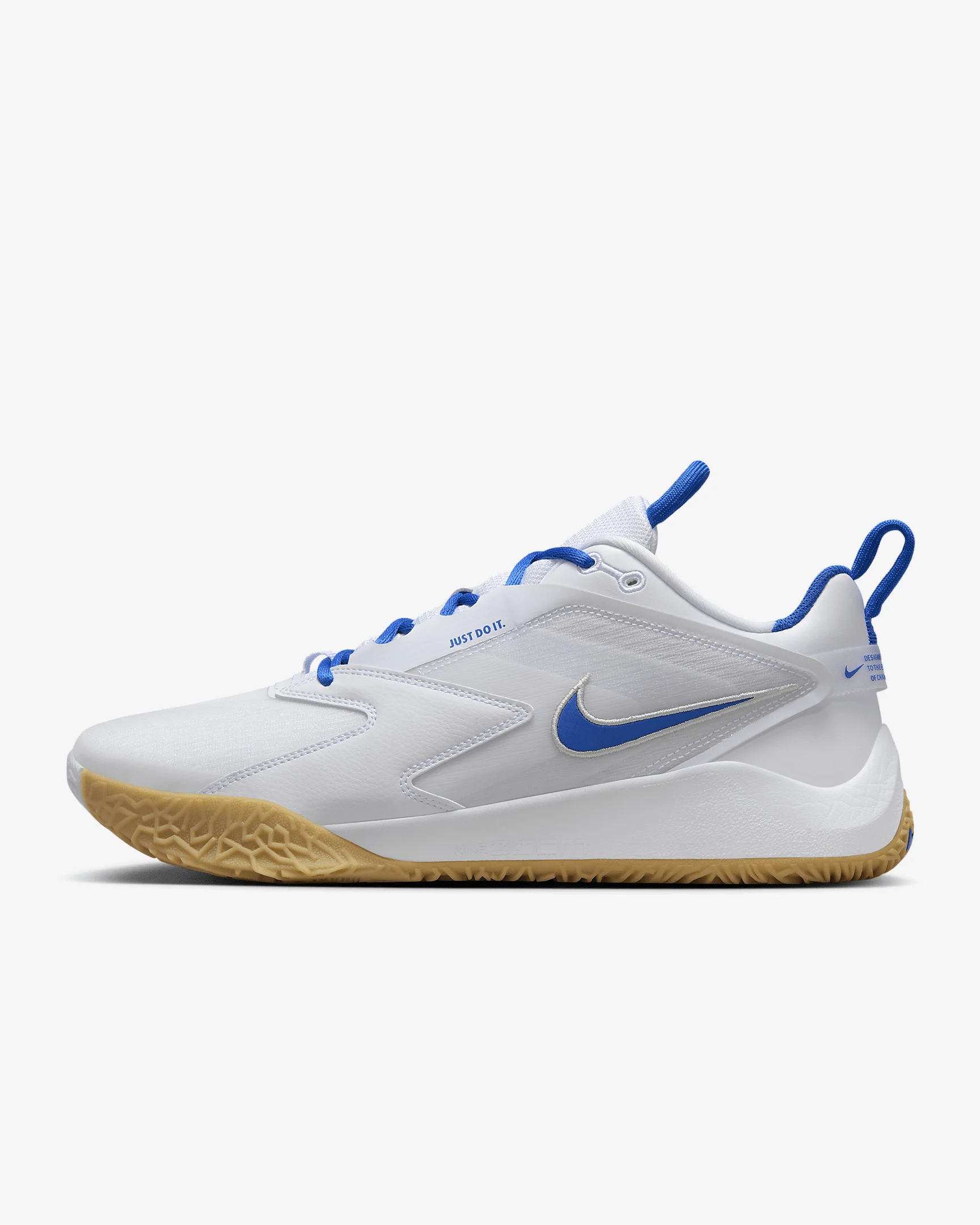Made for the all-out hustlers who refuse to give up on any play, the HyperAce 3 has you ready for your match. Its sleek, quick design is perfect for instant-reaction plays, cat-quick digs and scurrying into position for a bump. A new outsole and Air Zoom cushioning blend with an agile, lightweight build to help you lunge and last all-match long. More Benefits - An internal webbing system helps secure your foot into the shoe once you lace up. - The collar is plush and supportive to help keep your ankle and heel from rolling. Product Details - Shown: White/Photon Dust/Game Royal - Style: FQ7074-106