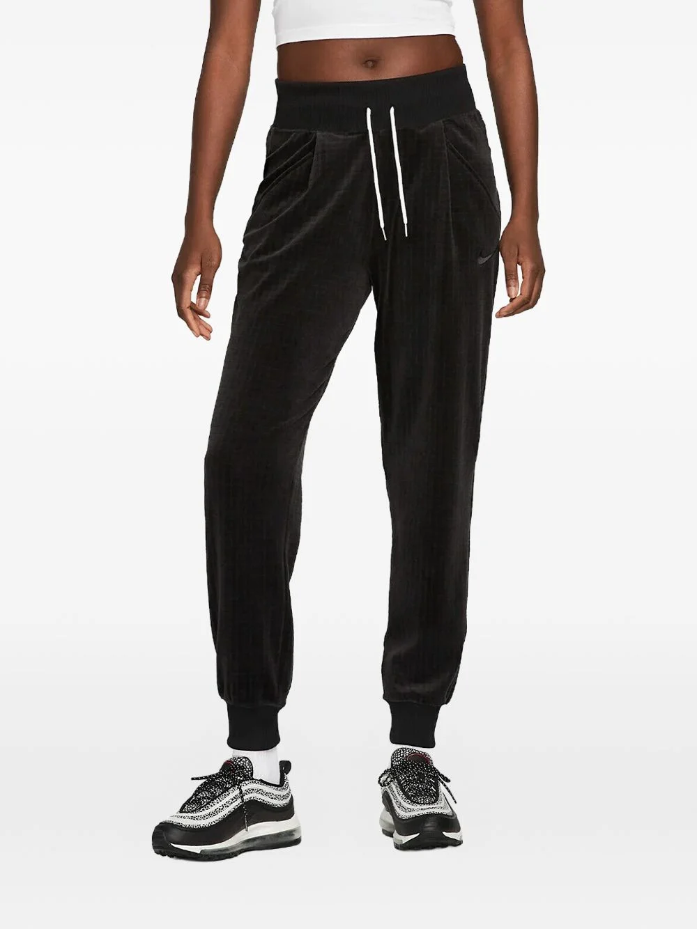 velour track pants Highlights - Black - High-waisted - Ribbed trim - Front pockets Imported Composition Bottoms: Fabric 100%
