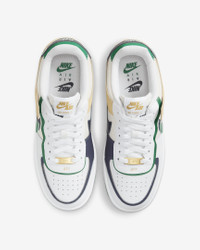 Everything you love about the AF1—but doubled! The Air Force 1 Shadow puts a playful twist on a hoops icon to highlight the best of AF1 DNA. With 2 eyestays, 2 mudguards, 2 backtabs and 2 Swoosh logos, you get a layered look with double the branding. Benefits - Leather in the upper ages to soft perfection. - Originally designed for performance hoops, Nike Air cushioning delivers lasting comfort. - Featuring the same iconic shape as the original AF1, a slightly exaggerated midsole makes these sneakers instantly recognizable. - Low-cut, padded collar looks sleek and feels great. - Foam midsole and grooved outsole ensure the shoe is lightweight, flexible and comfortable. - Rubber outsole with heritage hoops pivot circles adds durable traction. Product Details - Shown: White/Malachite/Sesame/Midnight Navy - Style: DZ1847-102 SIZE & FIT Fits small; we recommend ordering a half size up