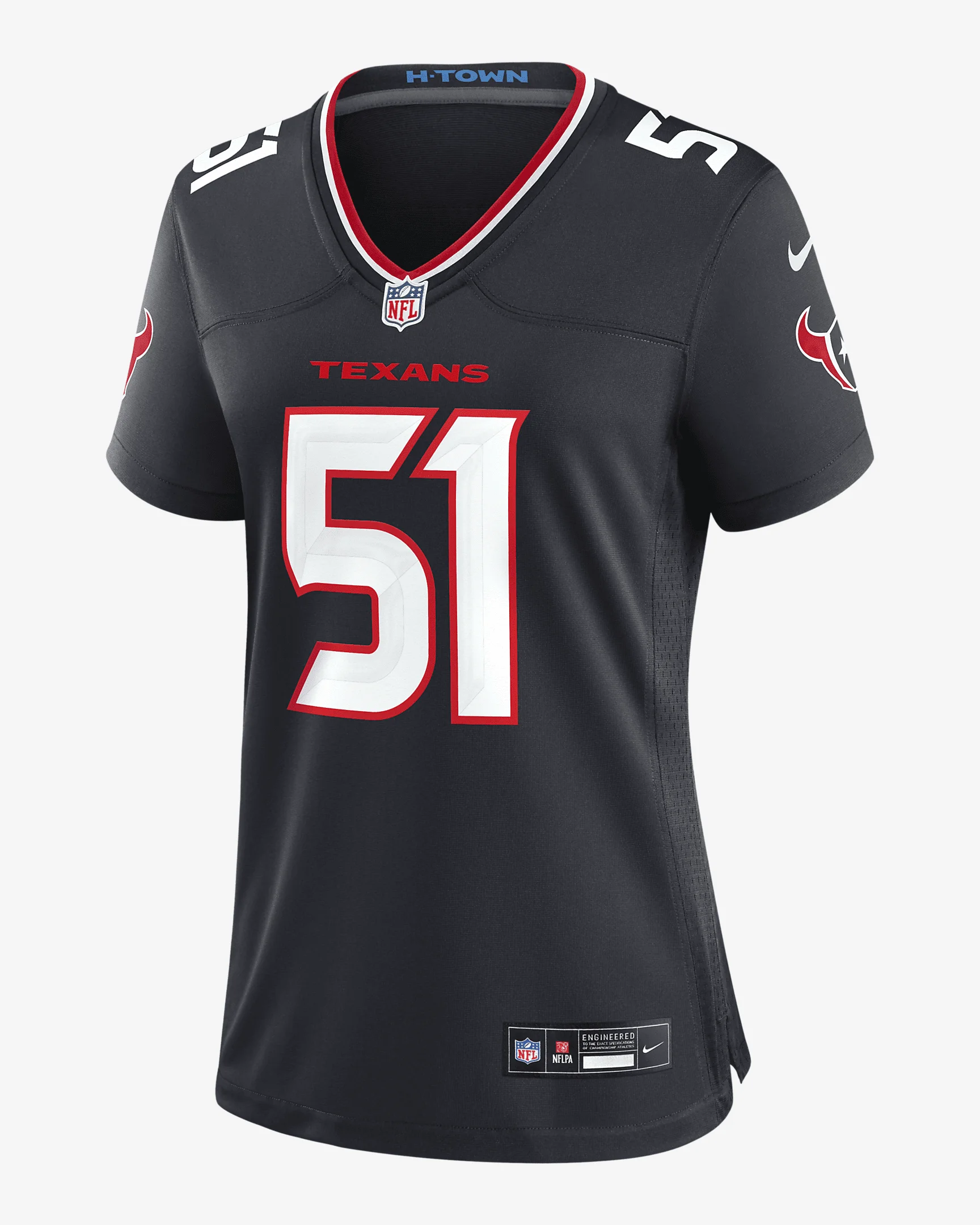 Rep one of your team's top stars with this Houston Texans Jersey. Proper ventilation and a form fit help provide a dry, comfortable wear with the authentic look of the on-field uniform. Benefits - Screen-printed name, number and team mark offer lightweight durability. - Ventilation over major heat zones helps keep you cool. Product Details - Standard fit for a relaxed, easy feel - NFL shield at V-neck - Tagless neck label - Woven jock tag - 100% polyester - Machine wash - Imported - Shown: Navy - Style: 67NW0B9F9HF-D1C