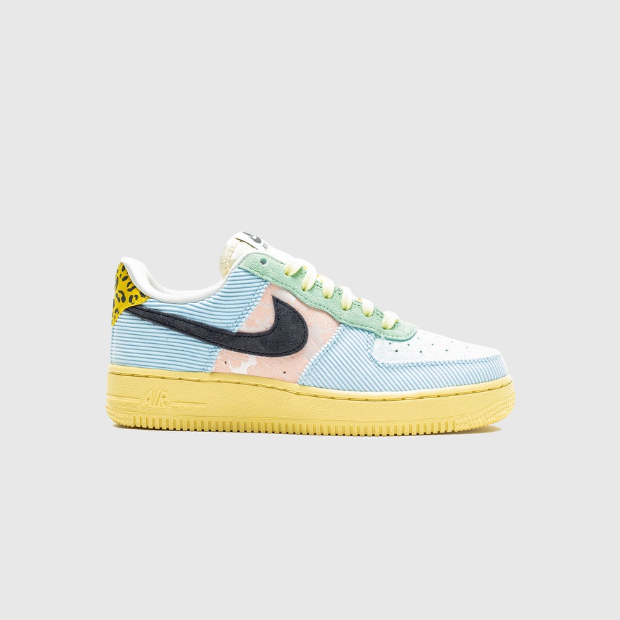 - FJ4591 441 - Celestine Blue/Off Noir-Arctic Orange - One of Nike's most iconic models done up in premium materials - Mixed material upper - Corduroy, suede and floral textile overlays - Floral textile toe box - Pastel nylon tongue with "NIKE AIR FORCE 1" tongue tag - Black suede swoosh - Leopard print heel cap with tonal "NIKE AIR" branding - Yellow rubber midsole with encapsulated "AIR" unit in the heel - Yellow rubber outsole