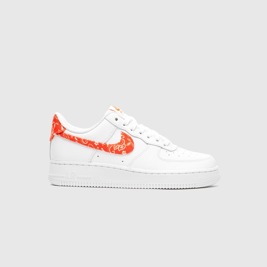 - DJ9942 102 - White/Rush Orange/White - The iconic Air Force 1 done up in a brand new women's exclusive colorway - White tumbled leather upper - White nylon canvas tongue with white "NIKE AIR FORCE 1" branding - Rush orange paisley print canvas swoosh - Rush orange paisley print canvas heel cap with white "NIKE AIR" embroidery - White rubber midsole with encapsulated "AIR" unit in the heel - White rubber outsole - Double layered cloth laces