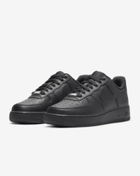 The radiance lives on in the Nike Air Force 1 ’07, the b-ball icon that puts a fresh spin on what you know best: crisp leather, bold colors and the perfect amount of flash to make you shine. A subtle platform gives you just the right amount of height. Benefits - Smooth leather with stitched overlays ages to soft perfection. - Originally designed for hoops, Nike Air cushioning adds lightweight, all-day comfort. - Padded, low-cut collar looks sleek and feels great. Product Details - Foam midsole - Rubber outsole - Perforations on the toe - Shown: Black/Black/Black/Black - Style: DD8959-001 SIZE & FIT Fits large; we recommend ordering a half size down