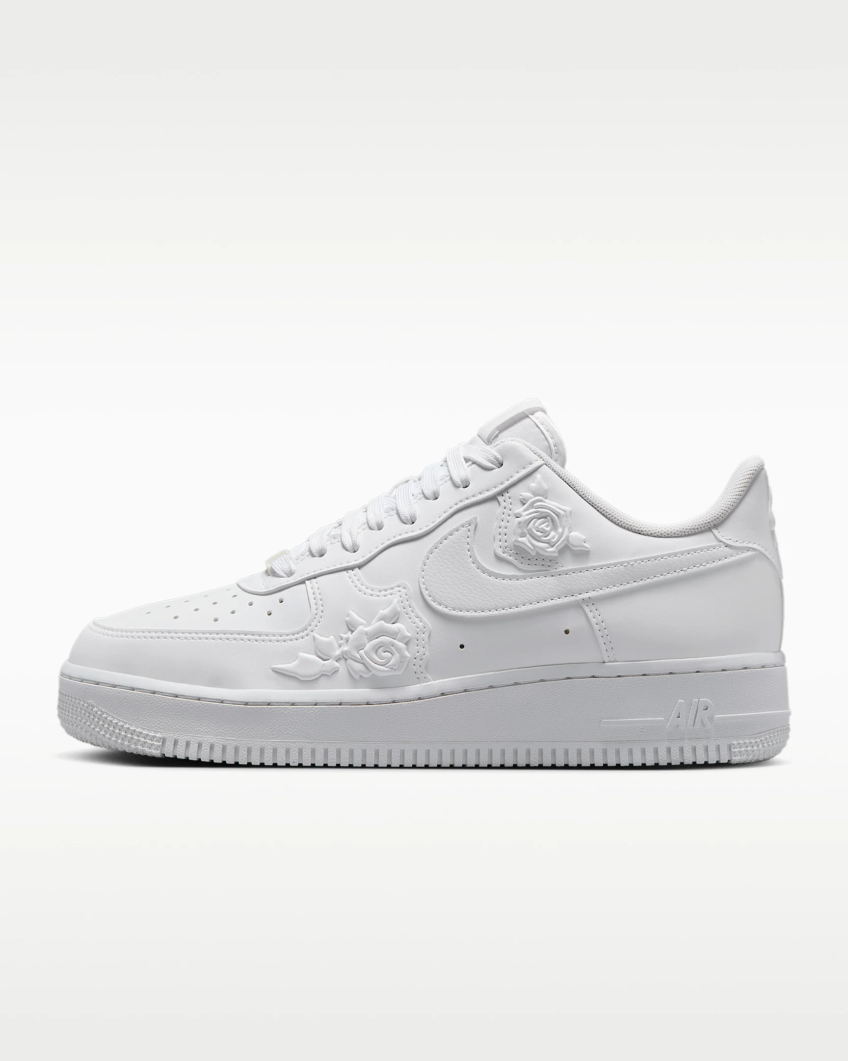 Comfortable, durable and timeless—it’s number one for a reason. The classic ‘80s construction pairs with elevated details like embossed roses for style that tracks whether you’re on court or on the go. Benefits - Synthetic leather upper with a perforated toe box is breathable and comfortable. - Originally designed for performance hoops, Nike Air cushioning adds lightweight, all-day comfort. - Rubber outsole with heritage hoops pivot circles delivers traction and durability. Product Details - Padded collar - Foam midsole - Shown: White/White/Black/White - Style: HF2016-100