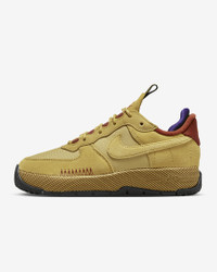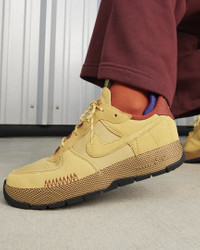 The outdoors is for everyone—and this shoe is too. The classic AF1 gets an adventurous refresh with utility lacing, durable materials and sturdy stitching. The textile-wrapped midsole is light and more flexible, while an added heel pillow creates extra comfort. Embroidered accents contrast with boot-like details for a look that's versatile and functional. More Benefits - Low-cut, padded collar looks sleek and feels great - Originally designed for performance hoops, Nike Air cushioning delivers lasting comfort. - Rubber outsole with hoops pivot circles adds durable traction and heritage style. Product Details - Shown: Wheat Gold/Rugged Orange/Field Purple/Wheat Gold - Style: FB2348-700 SIZE & FIT Fits large; we recommend ordering a half size down