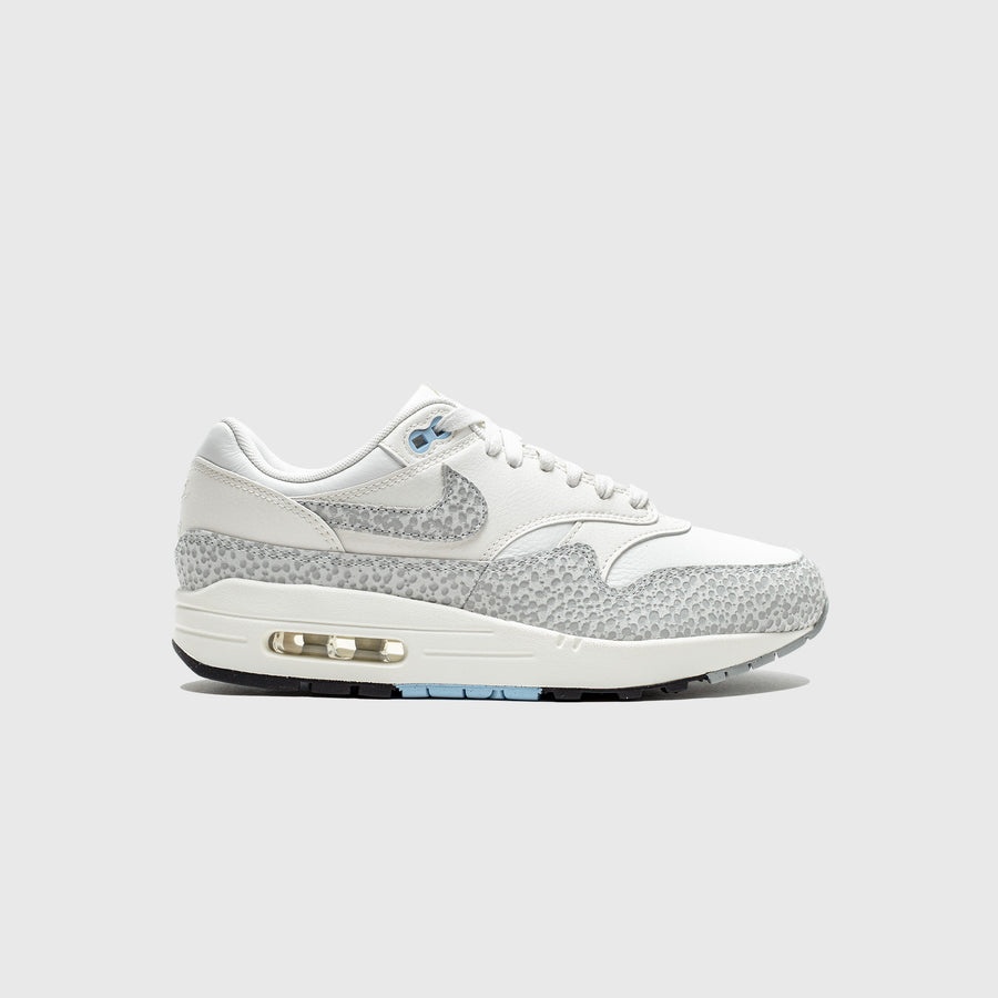 - FB5059 100 - Summit White/Phantom-Sail-Photon Dust - The women's Nike Air Max '87 Safari adopts a neutral take on the famed 2002 collab with Atmos - Summit white leather upper with Safari patterned mudguard - Safari patterned swoosh - White leather tongue with tonal sail "NIKE SWOOSH" tongue tag - Summit leather heel panel with embroidered "NIKE AIR" branding - Summit white midsole with white "AIR" unit in the heel - Black & baby blue rubber outsole