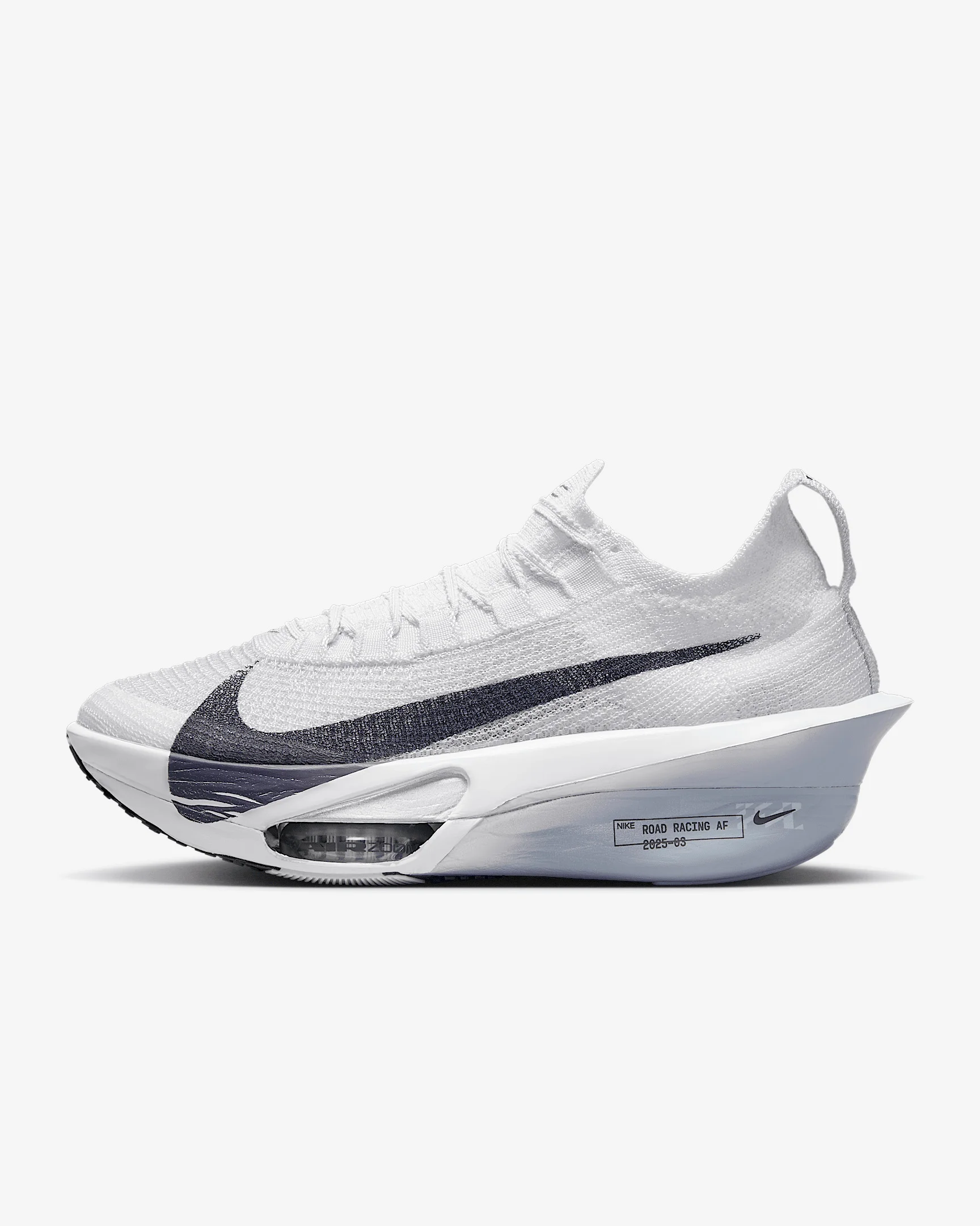 Fine-tuned for marathon speed, the Alphafly 3 helps push you beyond what you thought possible. Three innovative technologies power your run: A double dose of Air Zoom units helps launch you into your next step; a full-length carbon fiber plate helps propel you forward with ease; and a heel-to-toe ZoomX foam midsole helps keep you fresh from start to 26.2. Time to leave your old personal records in the dust. More Benefits - Notched laces offer a secure but soft lace-up. - Integrated knit tongue with lofted padding helps alleviate lace pressure. Product Details - Weight: Approx. 174g/6.1oz (Women's US 8) - Heel-to-toe drop: 8mm - Shown: White/Pure Platinum/Obsidian Mist/Gridiron - Style: FD8315-102 SIZE & FIT Fits small; we recommend ordering a half size up