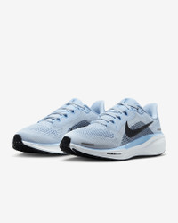Responsive cushioning in the Pegasus provides an energized ride for everyday road running. Experience lighter-weight energy return with dual Air Zoom units and a ReactX foam midsole. Plus, improved engineered mesh on the upper decreases weight and increases breathability. Benefits - Upgraded breathable engineered mesh upper - ReactX foam midsole surrounds forefoot and heel Air Zoom units for an energized ride. - Signature waffle-inspired rubber outsole for traction and flexibility - Plush collar tongue and sockliner for a secure and comfortable fit - What's new? All-new ReactX foam midsole is 13% more responsive than previous React technology. - Crafted for performance and planet, ReactX foam is engineered to reduce its carbon footprint by at least 43% in a pair of midsoles due to reduced manufacturing process energy compared to prior React foam. The carbon footprint of ReactX is based on cradle-to-gate assessment reviewed by PRe Sustainability B.V and Intertek China. Other midsole components such as airbags, plates or other foam formulations were not considered. Product Details - Weight: Approx. 251 g/8.8 oz (Women's US 8) - Heel-to-toe drop: 10 mm - MR-10 Last - Our best, most consistent fit (same as Pegasus 40) - Not intended for use as Personal Protective Equipment (PPE) - Shown: Blue Tint/Psychic Blue/Smokey Blue/Black - Style: FD2723-404