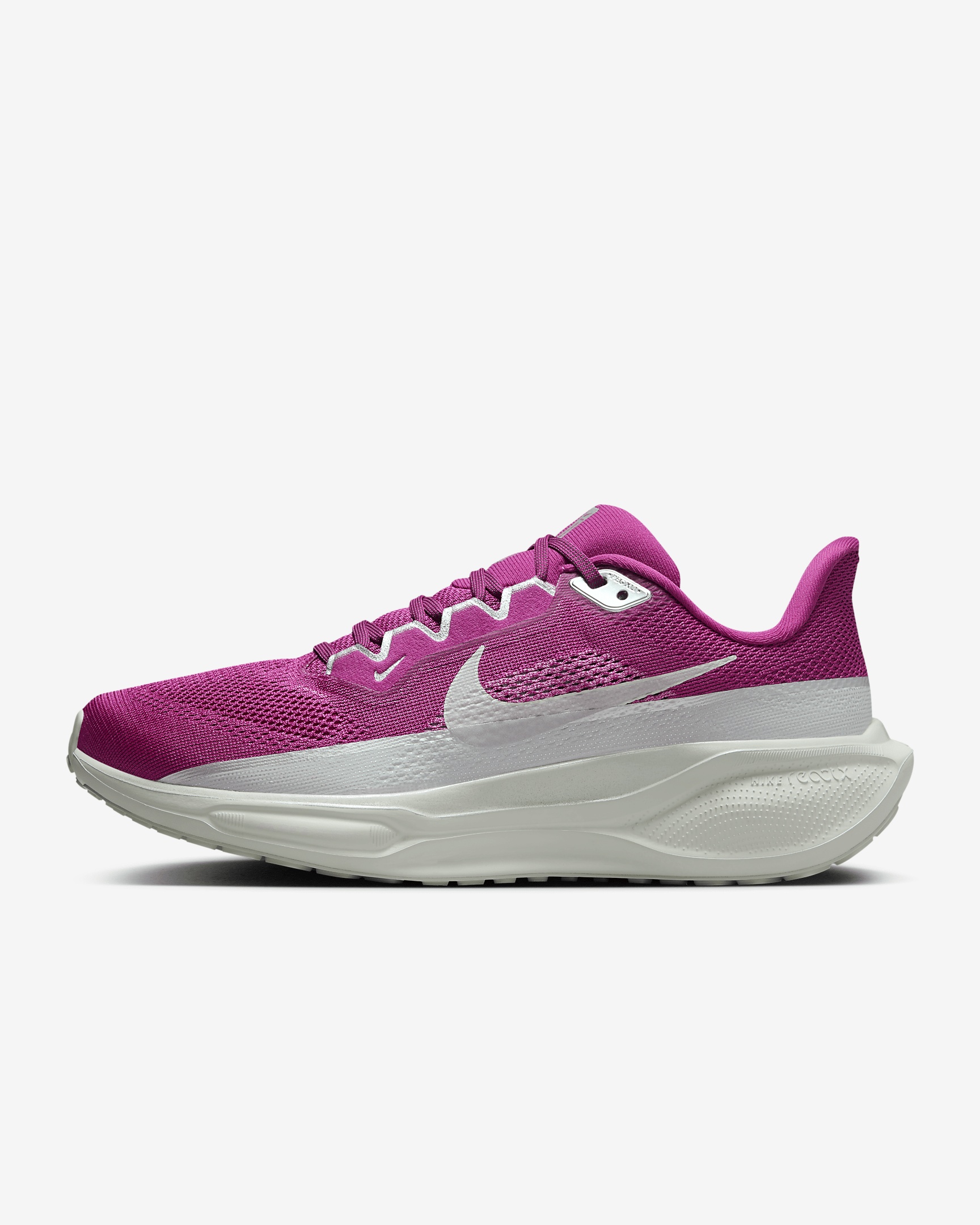 Responsive cushioning in the winterized Pegasus provides an energized ride for everyday road running, day or night. Experience lighter-weight energy return with dual Air Zoom units and a ReactX foam midsole. Plus, reflective paint covers the midsole and extends onto the upper to light up your route. Benefits - Upgraded breathable engineered mesh upper - ReactX foam midsole surrounds forefoot and heel Air Zoom units for an energized ride. - Signature waffle-inspired rubber outsole for traction and flexibility - Plush collar, tongue and sockliner for a secure and comfortable fit - What's new? All-new ReactX foam midsole is 13% more responsive than previous React technology. - Crafted for performance and planet, ReactX foam is engineered to reduce its carbon footprint by at least 43% in a pair of midsoles due to reduced manufacturing process energy compared to prior React foam. The carbon footprint of ReactX is based on cradle-to-gate assessment reviewed by PRe Sustainability B.V and Intertek China. Other midsole components such as airbags, plates or other foam formulations were not considered. Product Details - Reflective paint on midsole - Reflective Swoosh logo, overlays and laces - Not intended for use as Personal Protective Equipment (PPE) - Weight: Approx. 251 g/8.8 oz (Women's US 8) - Heel-to-toe drop: 10 mm - MR-10 Last - Our best, most consistent fit (same as Pegasus 40) - Shown: Hot Fuchsia/Light Silver/Medium Fuchsia/Metallic Silver - Style: FZ1626-500