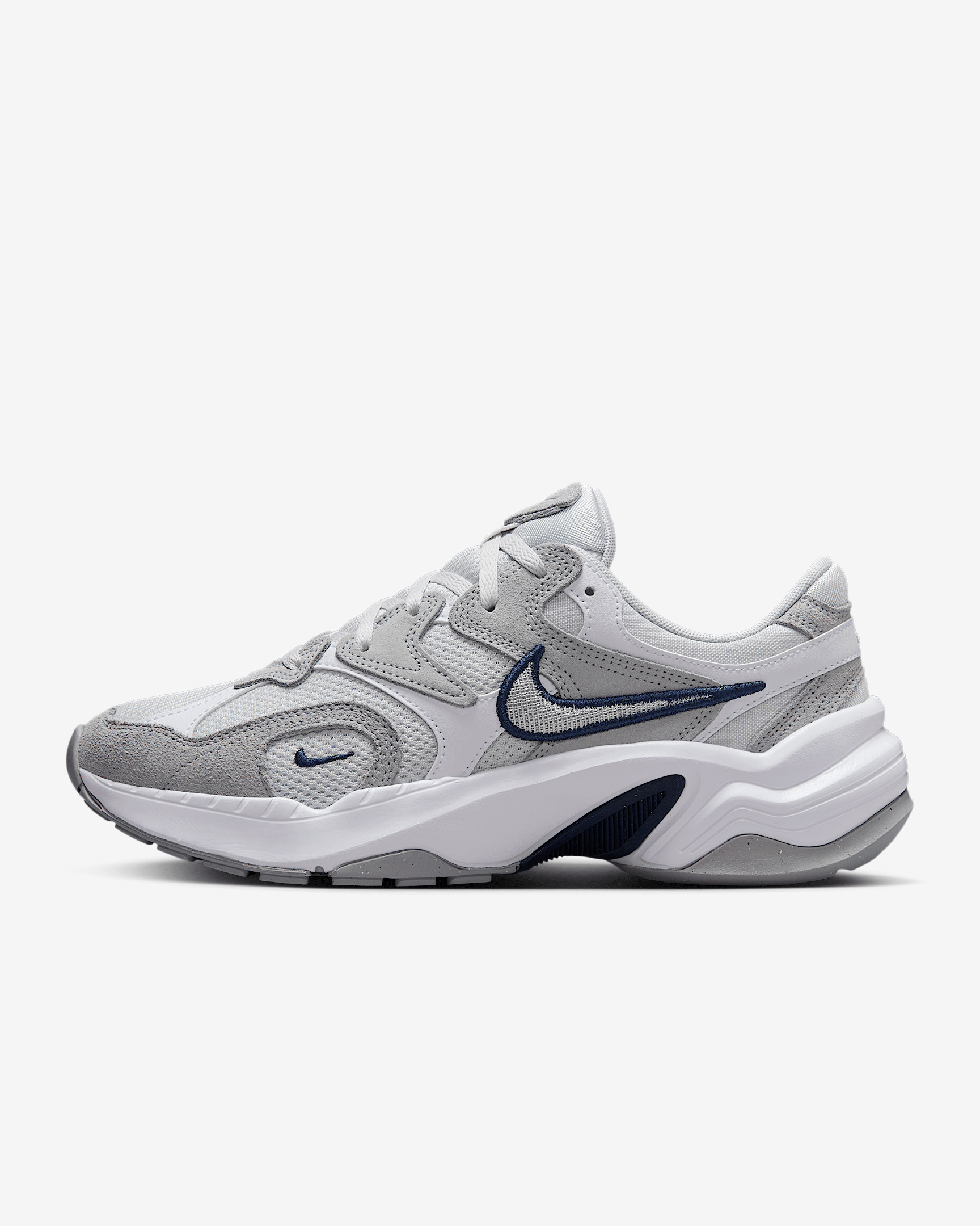 The AL8 is the perfect mix of nostalgia (peep the embroidered Swoosh) and the modern comfort you love. The plush upper combines breathable mesh and a chunky silhouette for a sporty look that's easy to style. Plus, a flexible Waffle sole references retro running shoes while providing the traction you need to go all day. Inspired by the '90s, ready for the future. Benefits - Mesh upper with leather and suede overlays allows breathability without compromising comfort. - Waffle outsole and classic Swoosh logo reference classic Nike running shoes. Product Details - Foam midsole - Rubber outsole - Not intended for use as Personal Protective Equipment (PPE) - Shown: Wolf Grey/Midnight Navy/White/Photon Dust - Style: FJ3794-004