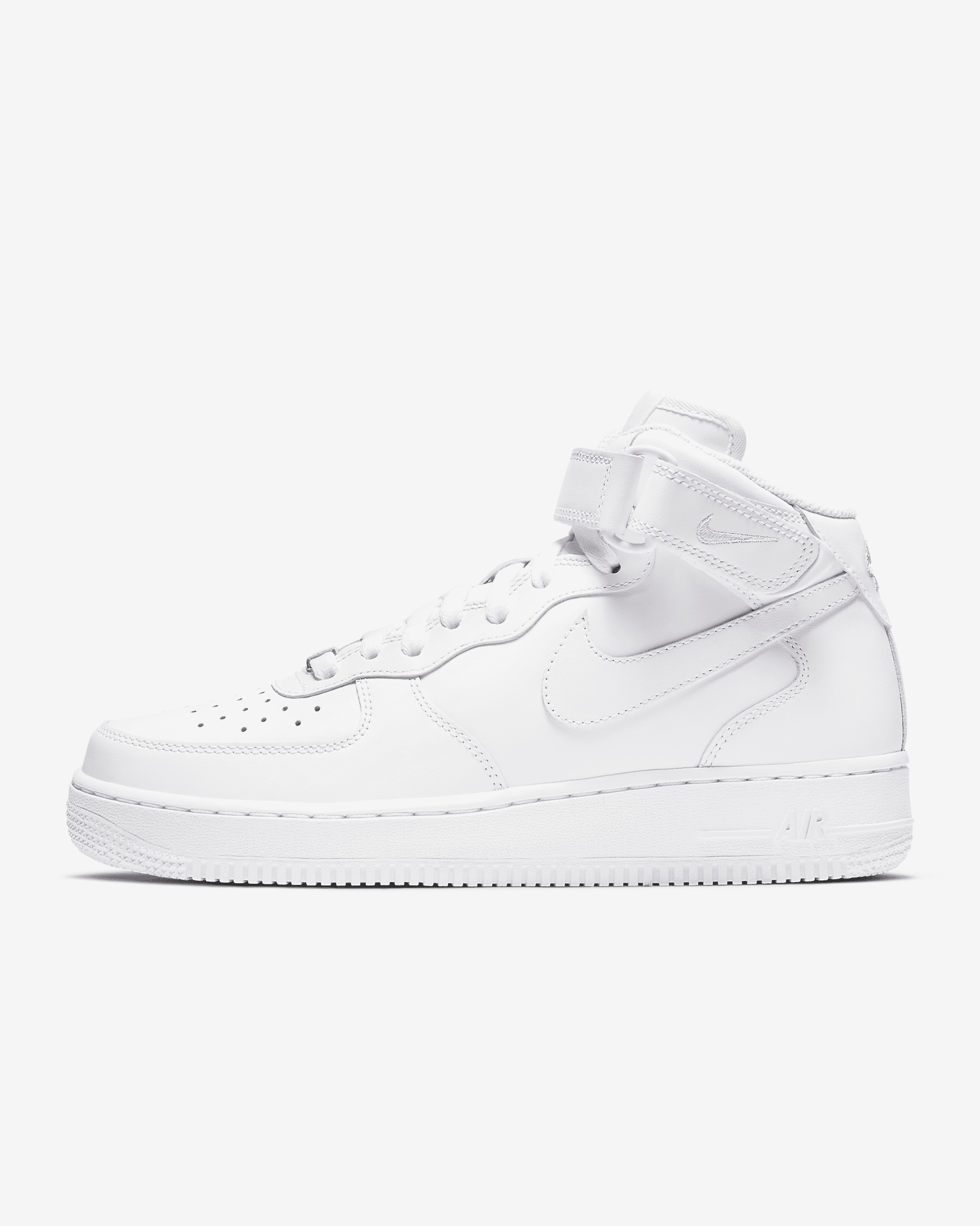 The Air Force 1 '07 Mid is everything you love best: crisp overlays, bold accents and the perfect amount of flash to let you shine. The padded, mid-height collar with classic hook-and-loop closure mixes style versatility with heritage b-ball comfort while perforations on the toe keep you cool. Benefits - The crisp, easy to clean upper nods to legendary hoops style while the mid-height design locks in the fit. It's history, looks and the symbol of freshness all wrapped into 1. - The leather overlays are smoother than backboard glass, durable and add comfort to every step. - Originally designed for hoops, the Air cushioning delivers lasting comfort while the padded ankle and tongue pillow every step. Product Details - Foam midsole - Variable width lacing system - Hook and loop closure lets you customize styling and fit - Padded mid-height collar provides a comfortable fit - Perforations on the toe - Non-marking rubber sole adds traction and durability - Shown: White/White/White - Style: DD9625-100