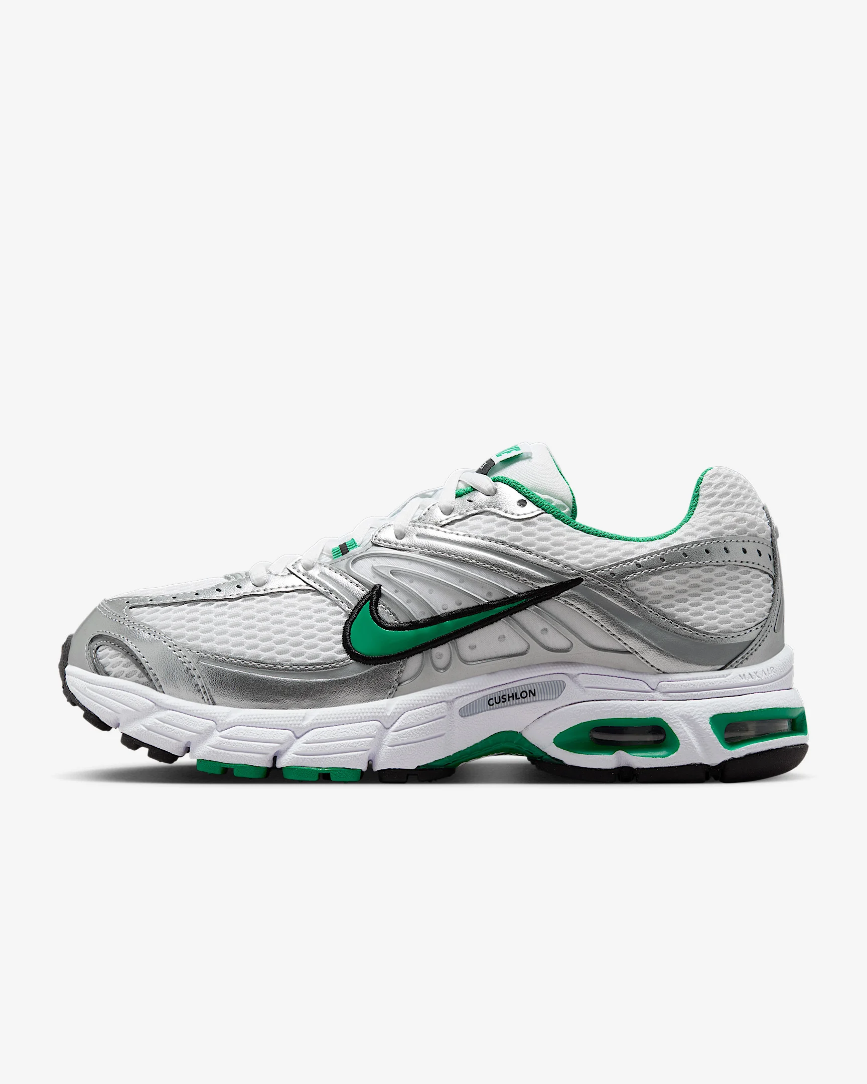 Familiar yet fresh, the Air Max Moto 2K is ready to go for a ride. Metallic accents compliment performance-inspired details and Max Air cushioning. Benefits - Upper mixes synthetic leather and textile for a layered look built to last. - Plush and comfortable, Max Air cushioning has just the right amount of support. - Rubber outsole provides durable traction. Product Details - Shown: White/Metallic Silver/Black/Stadium Green - Style: HQ2056-102