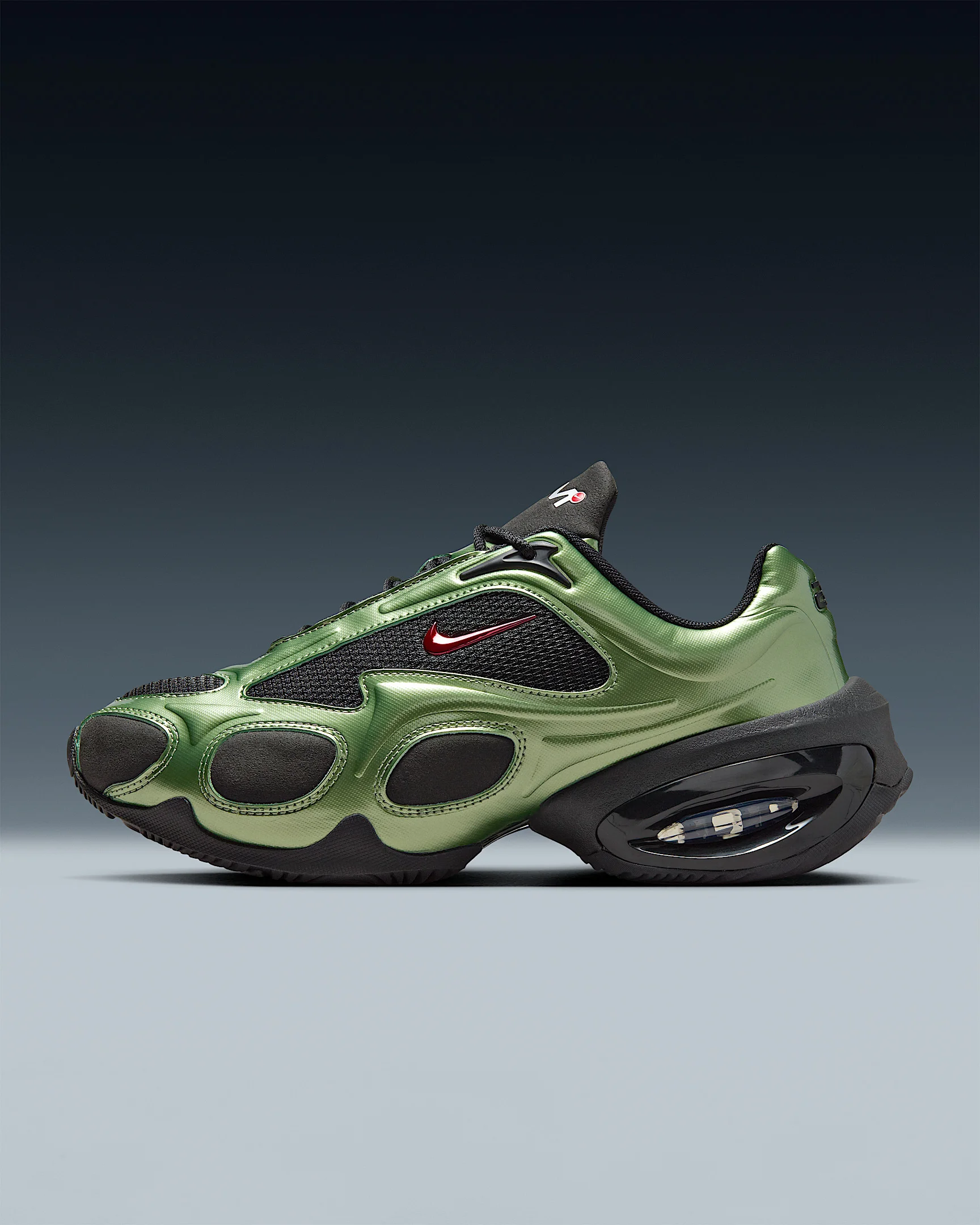 The Air Max Muse is a bold, futuristic addition to the Air Max family. Its exaggerated proportions, sleek finishes and unexpectedly high arch showcase the shoe’s namesake Air technology. Get ready. A new era of expression is here. Benefits - Upper combines synthetic leather and textiles for a durable, layered look. - Strategically placed mesh adds breathability. - Plush and comfortable, Max Air cushioning has just the right amount of support. - New Air Max logo is featured on the tongue. Product Details - Metallic accents - Foam midsole - Rubber outsole - Shown: Black/Oil Green/Metallic Silver/University Red - Style: FV1920-004