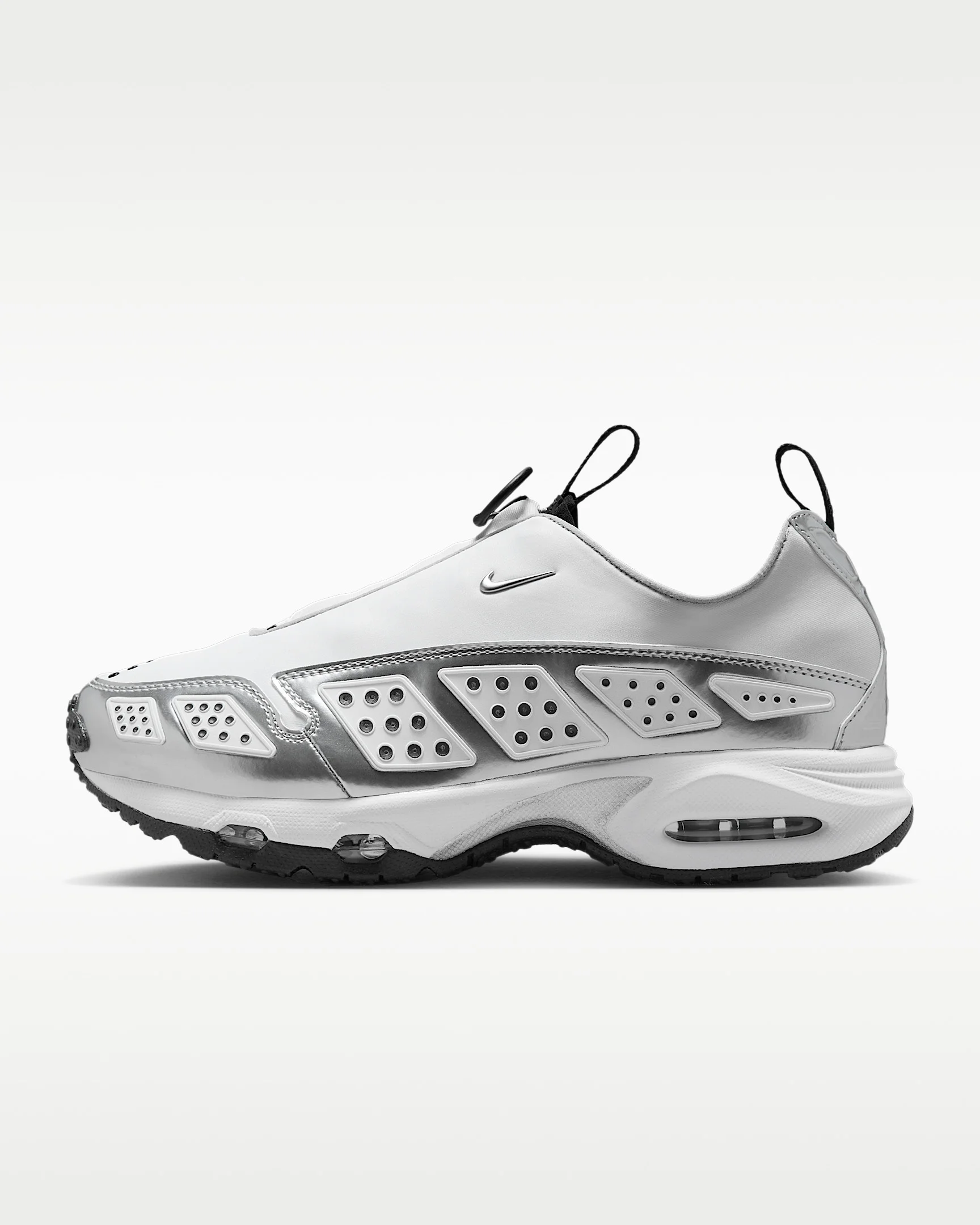Ahead of its time in '99, the futuristic Air Max SNDR is back and classier than ever. It continues to break the mold with a new metallic colorway and signature reflective panels that flicker along the mudguard. Unzip the shroud to reveal "6453," a nod to the last 4 digits of Nike's office numbers around the world, which spell out N-I-K-E on the keypad. Benefits - Textile and synthetic leather provides a comfortable fit that lasts. - Plush and comfortable, Max Air cushioning has just the right amount of support. Product Details - Reflective elements - Foam midsole - Rubber outsole - Not intended for use as Personal Protective Equipment (PPE) - Shown: White/Black/Metallic Silver - Style: HJ4130-100