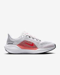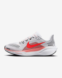 Responsive cushioning in the Pegasus provides an energized ride for everyday road running. Experience lighter-weight energy return with dual Air Zoom units and a ReactX foam midsole. Plus, improved engineered mesh on the upper decreases weight and increases breathability. Benefits - Upgraded breathable engineered mesh upper - ReactX foam midsole surrounds forefoot and heel Air Zoom units for an energized ride. - Signature waffle-inspired rubber outsole for traction and flexibility - Plush collar tongue and sockliner for a secure and comfortable fit - What's new? All-new ReactX foam midsole is 13% more responsive than previous React technology. - Crafted for performance and planet, ReactX foam is engineered to reduce its carbon footprint by at least 43% in a pair of midsoles due to reduced manufacturing process energy compared to prior React foam. The carbon footprint of ReactX is based on cradle-to-gate assessment reviewed by PRe Sustainability B.V and Intertek China. Other midsole components such as airbags, plates or other foam formulations were not considered. Product Details - Weight: Approx. 251 g/8.8 oz (Women's US 8) - Heel-to-toe drop: 10 mm - MR-10 Last - Our best, most consistent fit (same as Pegasus 40) - Not intended for use as Personal Protective Equipment (PPE) - Shown: White/Magic Ember/Black/Bright Crimson - Style: FD2723-109