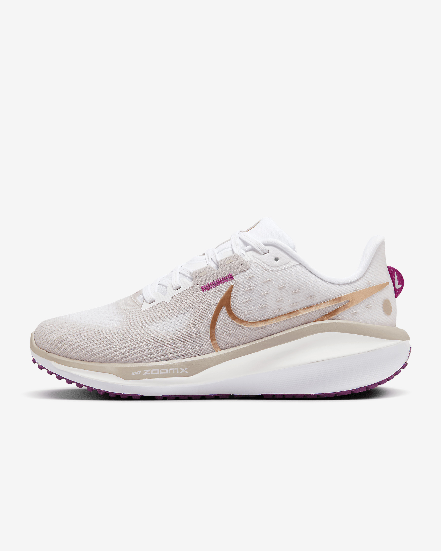 Maximum cushioning provides a comfortable ride for everyday runs. Experience enhanced comfort in this latest version with a dual-density midsole made with a combination of ZoomX underfoot and Cushlon 3.0 foam throughout. Plus, a new engineered mesh upper offers more breathability. Benefits - New engineered mesh upper for soft breathability - Dual-density midsole with ZoomX foam stacked on top of Cushlon 3.0 foam for a comfortable ride - Redesigned waffle-inspired outsole with break points for a smooth, flexible stride - Plush tongue and lining for a comfortably snug feel - What’s New? New stacked foam midsole with premium ZoomX on top of Cushlon 3.0 foam to amplify cushioned comfort. Product Details - Weight: Approx. 241g/ 8.5oz (Women's US 8) - Heel-to-toe drop: 10mm - MR-10 Last - Our best, most consistent fit - Not intended for use as Personal Protective Equipment (PPE) - Shown: Platinum Violet/White/Hot Fuchsia/Metallic Red Bronze - Style: FB8502-007