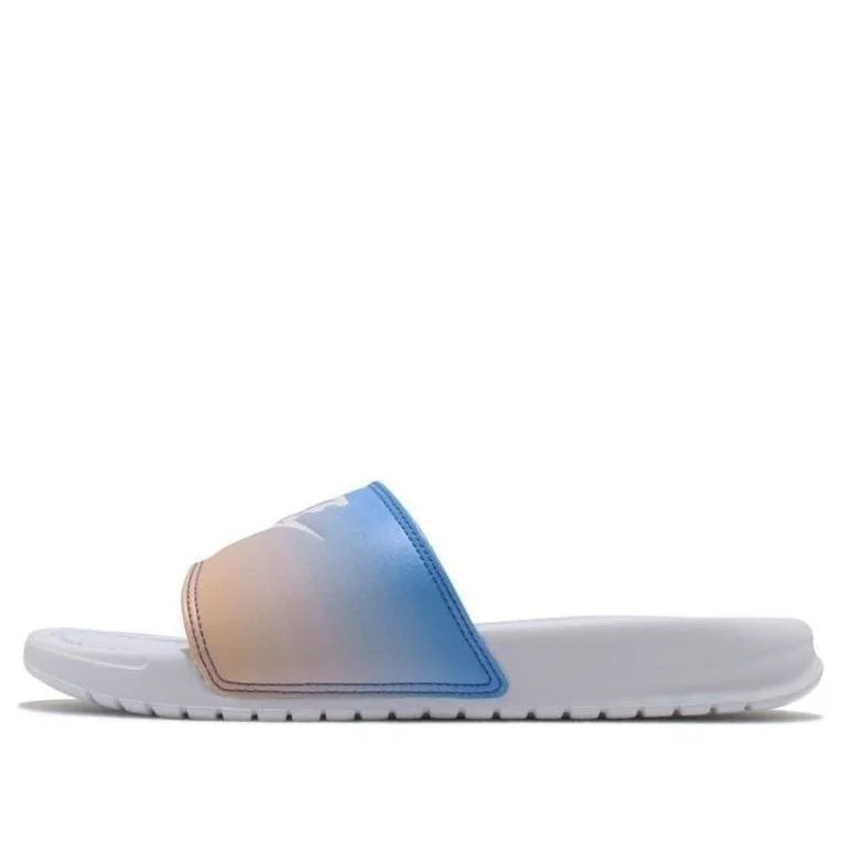 PRODUCT INFORMATION Model No: 618919-122 Release Date: 2020-08-21 Style: One-line style Colorway: White/Blue/Pink Heel Type: Flat heel Sole Material: Rubber Sole Season: Summer Color: WHITE Series: Benassi Nickname: White Hyper Royal Occasion: lifestyle
