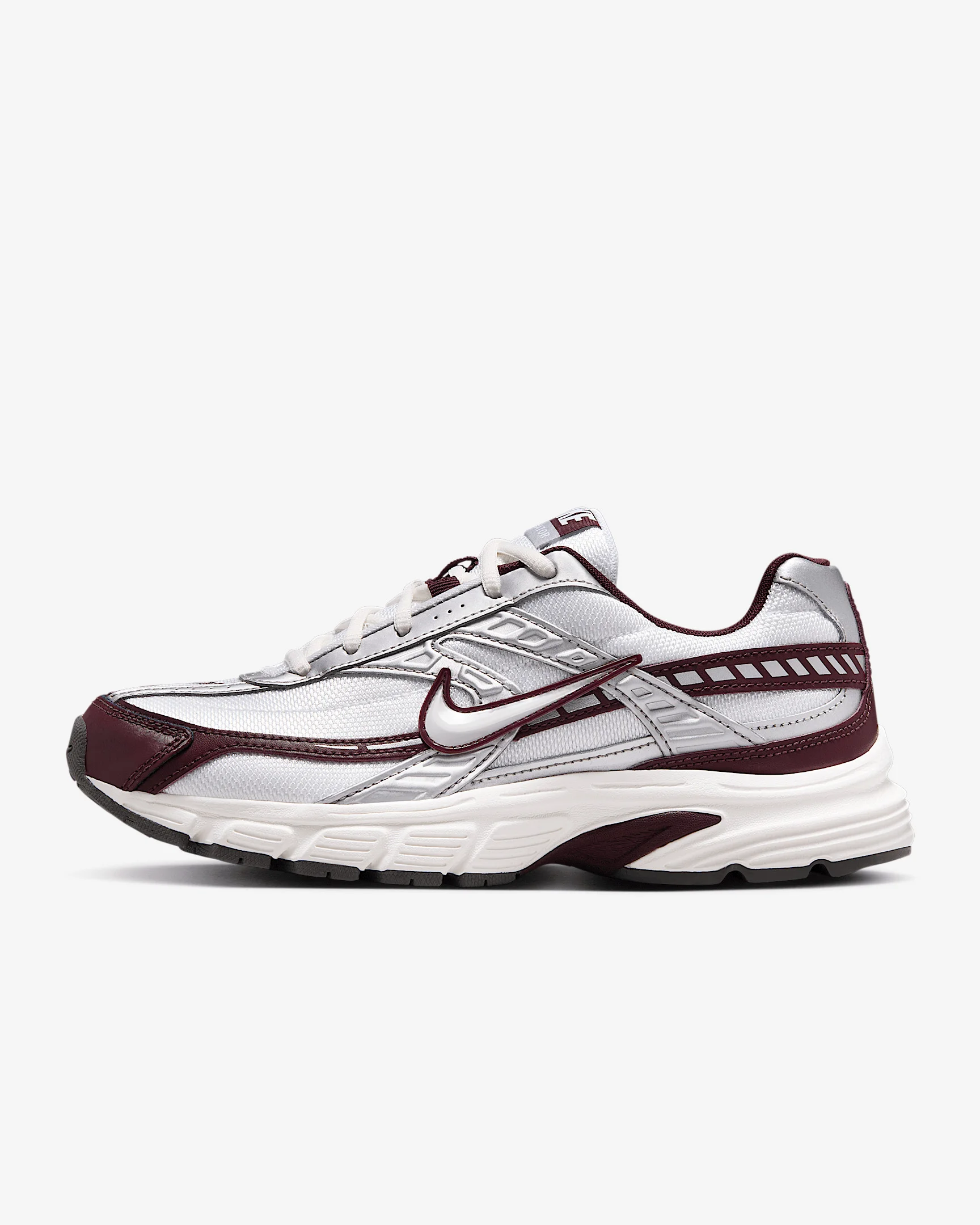 Put in miles with the comfortable support of the Nike Initiator. It pairs a breathable upper with soft cushioning to help you hit your stride again and again. Benefits - Supportive overlays help center your foot in the shoe. - Foam midsole provides a soft, cushioned ride. - Flex grooves in the outsole help you move freely. Product Details - Shown: White/Sail/Burgundy Crush/Sail - Style: IB4688-111