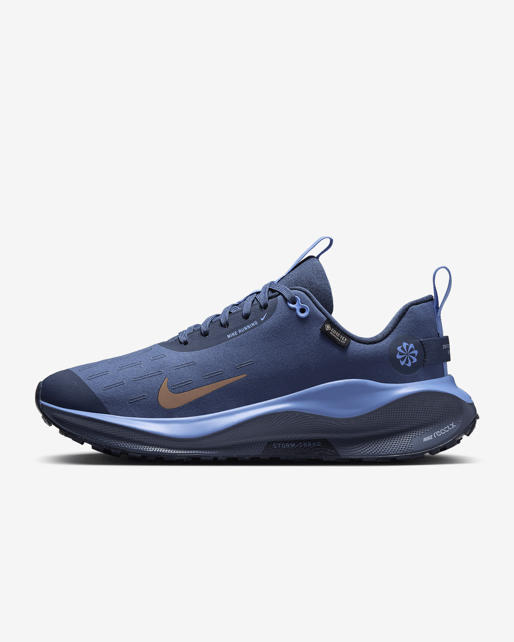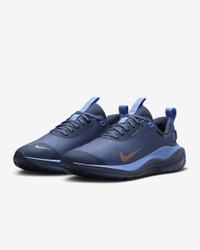 With a waterproof GORE-TEX upper and reflective details, this winterized Nike InfinityRN 4 is made for wet-weather runs. It provides maximum cushioning for elevated comfort. Experience a soft, rocker-shaped platform made with new ReactX foam underfoot and an ultra-comfortable collar and tongue for a snug feel. Benefits - A water-resistant membrane help keep you dry - A Storm Tread outsole provides reliable traction on wet and slippery surfaces. - New ReactX foam in the midsole for extra cushioning - Waffle outsole for durable traction on the roads - Ultra-comfortable collar and tongue for a soft, snug fit - What’s New? New ReactX cushioning for even more comfort and a revamped upper and wider toe box. Product Details - Weight: Approx. 281g/9.9oz (Women’s US 8) - Heel-to-toe drop: 9mm - Not intended for use as Personal Protective Equipment (PPE) - Shown: Thunder Blue/Diffused Blue/Royal Pulse/Metallic Red Bronze - Style: HQ0264-401