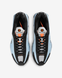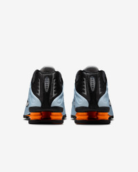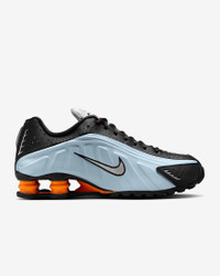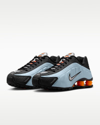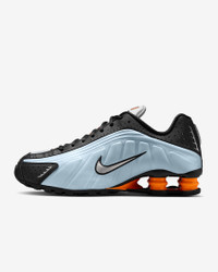 A recrafted version of the 2001 icon, the Nike Shox R4 replicates the original with its synthetic and textile upper, design lines and laser perforations. Nike Shox cushioning distributes weight to maximize comfort and provide a performance-inspired look. Benefits - Originally designed to support the stride of runners, Nike Shox columns provide responsive cushioning. - Upper is a near-exact replica of the original 2001 Nike Shox. - Modified, circular waffle outsole gives traction. - Laser perforations throughout provide ventilation. Product Details - Not intended for use as Personal Protective Equipment (PPE) - Shown: Blue Tint/Total Orange/Black/Metallic Silver - Style: AR3565-401