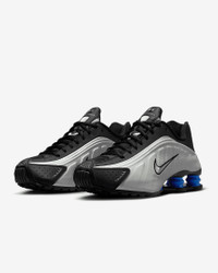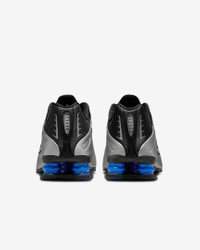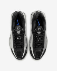 A recrafted version of the 2001 icon, the Nike Shox R4 replicates the original with its synthetic and textile upper, design lines and laser perforations. Nike Shox cushioning distributes weight to maximize comfort and provide a performance-inspired look. Benefits - Originally designed to support the stride of runners, Nike Shox columns provide responsive cushioning. - Upper is a near-exact replica of the original 2001 Nike Shox. - Modified, circular waffle outsole gives traction. - Laser perforations throughout provide ventilation. Product Details - Not intended for use as Personal Protective Equipment (PPE) - Shown: Black/Racer Blue/Metallic Silver - Style: AR3565-006