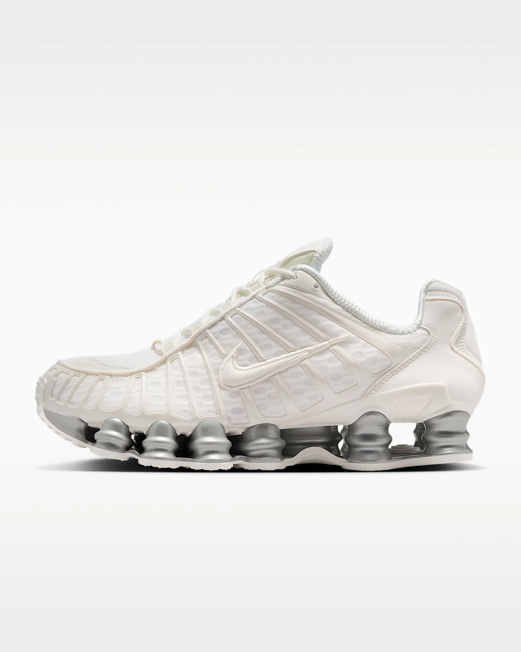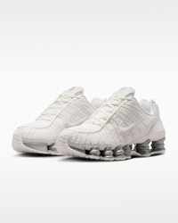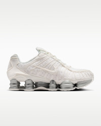 The Nike Shox TL takes mechanical cushioning to the next level. A recrafted version of the 2003 icon, it features breathable mesh in the upper and full-length Nike Shox technology for optimal impact absorption and a bold look on the streets. Benefits - Nike Shox technology combines resilient, flexible columns with moderator plates for outstanding cushioning that compresses and regains its shape. - Design is a near-exact replica of the 2003 Nike Shox TL. - Molded overlays throughout the midfoot provide support and a snug fit. - TPU plate in the heel supplies lateral stability and support. Product Details - Synthetic and textile upper - Rubber outsole - Not intended for use as Personal Protective Equipment (PPE) - Shown: Sail/Sail/Sail - Style: AR3566-103