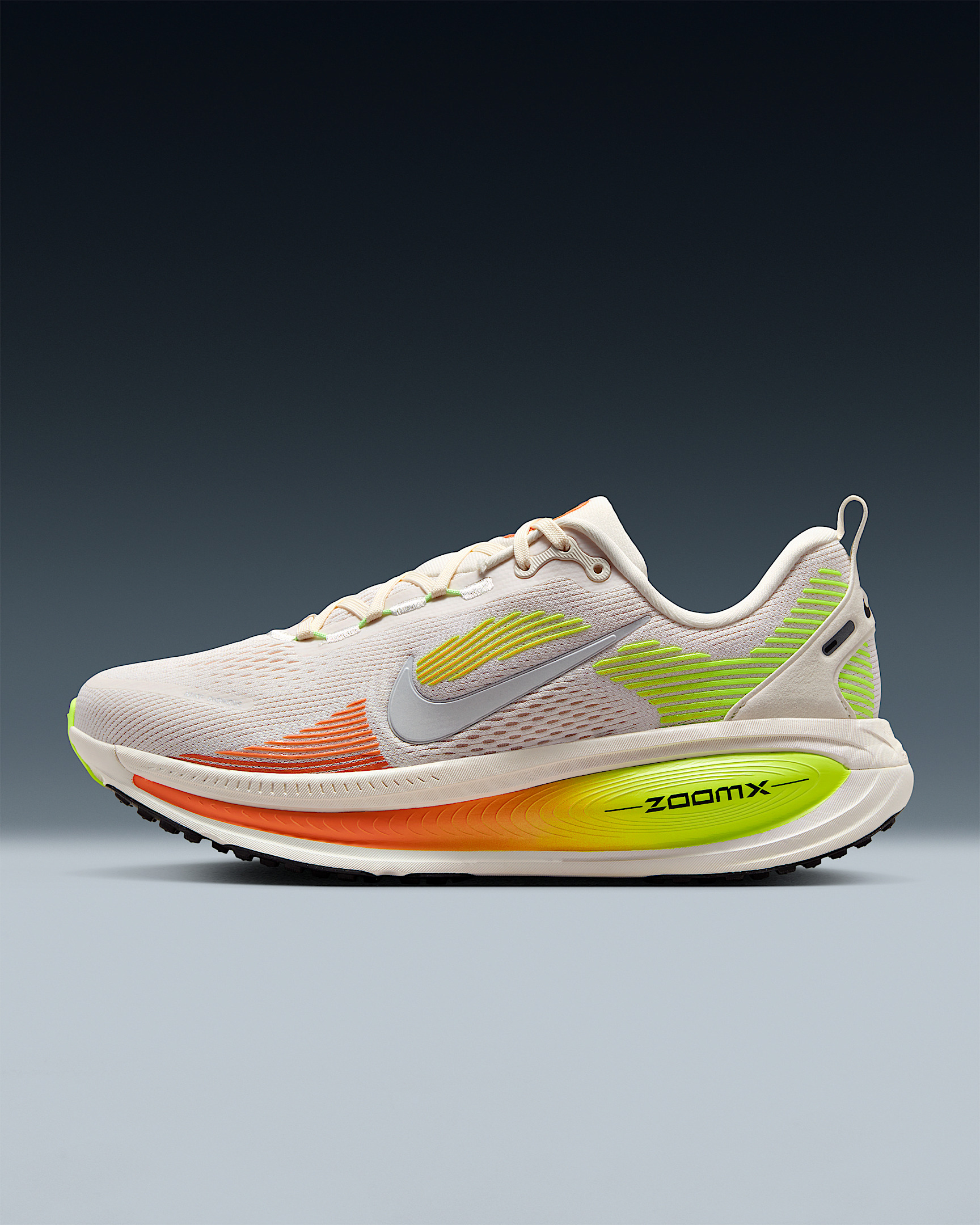 Maximum cushioning in the Vomero provides a comfortable ride for everyday runs. Our softest, most cushioned ride has lightweight ZoomX foam stacked on top of responsive ReactX foam in the midsole. Plus, a redesigned traction pattern offers a smooth heel-to-toe transition. Product Details - Weight: Approx. 263g/9.3oz (Women’s US 8) - Heel-to-toe drop: 10mm - MR-10 Last - Our best, most consistent fit - Not intended for use as Personal Protective Equipment (PPE) - Shown: Phantom/Light Wild Mango/Volt/Metallic Silver - Style: HM6804-002