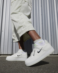 Comfortable, durable and timeless—the AF1 is a fan favorite for a reason. Classic '80s construction pairs with bold details for style that tracks whether you're on the court or on the go. Take your style up another notch with chrome accents on the laces. Benefits - Synthetic leather upper softens and gains vintage character with wear. - Originally designed for performance hoops, the Nike Air cushioning adds lightweight, all-day comfort. - Padded, low-cut collar looks sleek and feels great. Product Details - Perforations on the toe - Foam midsole - Rubber outsole - Shown: Sail/Sea Glass/Volt/Vapor Green - Style: FN8540-100