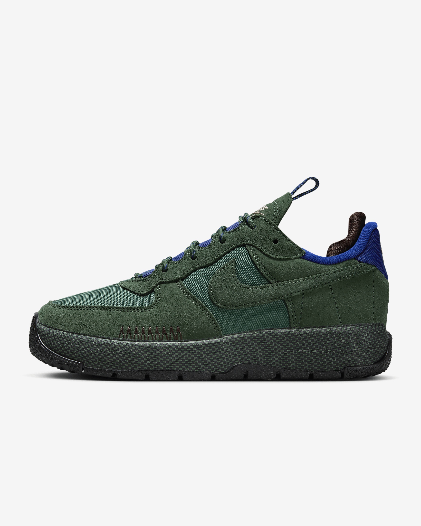 The outdoors is for everyone—and this shoe is too. The classic AF1 gets an adventurous refresh with utility lacing, durable materials and sturdy stitching. The textile-wrapped midsole is light and more flexible, while an added heel pillow creates extra comfort. Embroidered accents contrast with boot-like details for a look that's versatile and functional. More Benefits - Low-cut, padded collar looks sleek and feels great - Originally designed for performance hoops, Nike Air cushioning delivers lasting comfort. - Rubber outsole with hoops pivot circles adds durable traction and heritage style. Product Details - Shown: Fir/Earth/Deep Royal Blue/Fir - Style: FB2348-300 SIZE & FIT Fits large; we recommend ordering a half size down