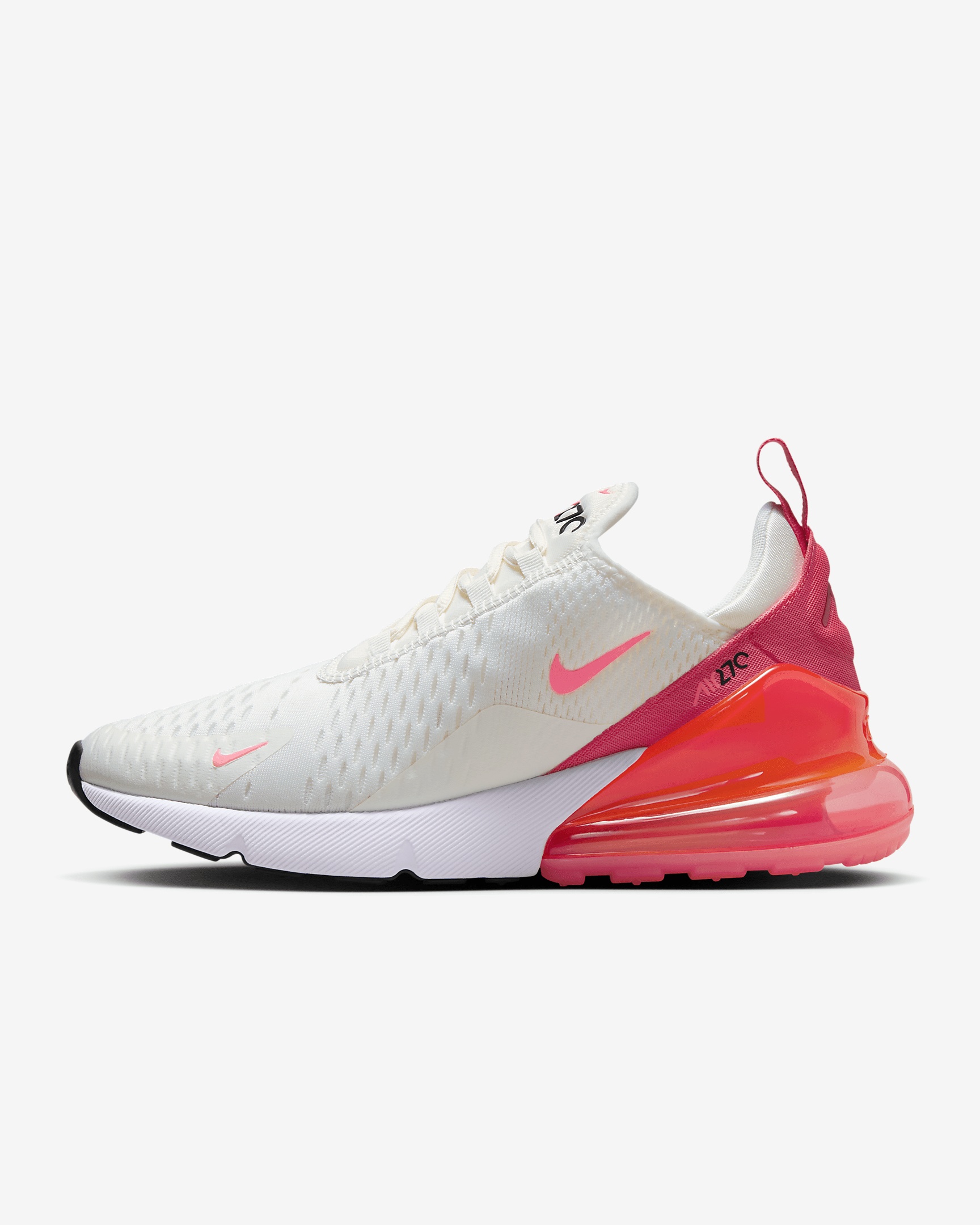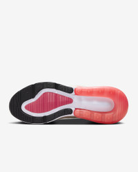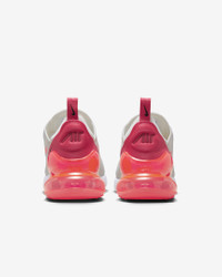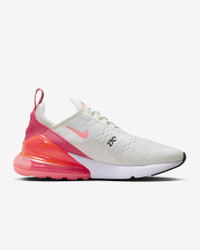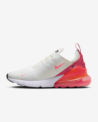 Nike's first lifestyle Air Max brings you style, comfort and big attitude in the Nike Air Max 270. The design draws inspiration from Air Max icons, showcasing Nike's greatest innovation with its large window and fresh array of colors. Benefits - The Max Air 270 unit delivers unrivaled, all-day comfort. - Woven and synthetic fabric on the upper provides a lightweight fit and airy feel. - The foam midsole feels soft and comfortable. - The stretchy inner sleeve and booty-like construction creates a personalized fit. - Rubber on the outsole adds traction and durability. Product Details - Mesh details for an airy feel - Synthetic and textile - Pull tab - Shown: Sail/Aster Pink/White/Hot Punch - Style: AH6789-122 SIZE & FIT Fits small; we recommend ordering a fl size up