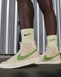 Styled for the ‘70s. Loved in the ‘80s. Classic in the ‘90s. Ready for the future. The Blazer Mid delivers a timeless design that’s easy to wear. The era-echoing suede breaks in beautifully and pairs with bold branding for a premium feel. Exposed foam on the tongue and a special midsole finish make it look like you’ve just pulled them from the history books. Go ahead—perfect your outfit. Benefits - Suede upper with leather accents adds texture and durability. - Vulcanized construction fuses the sole to the upper for a flexible, broken-in feel. - Rubber outsole with herringbone pattern adds durable traction and heritage style. - Padded, mid-cut collar looks sleek and feels great. Product Details - Shown: Muslin/Coconut Milk/Sail/Chlorophyll - Style: DV7006-100 SIZE & FIT Fits small; we recommend ordering a half size up