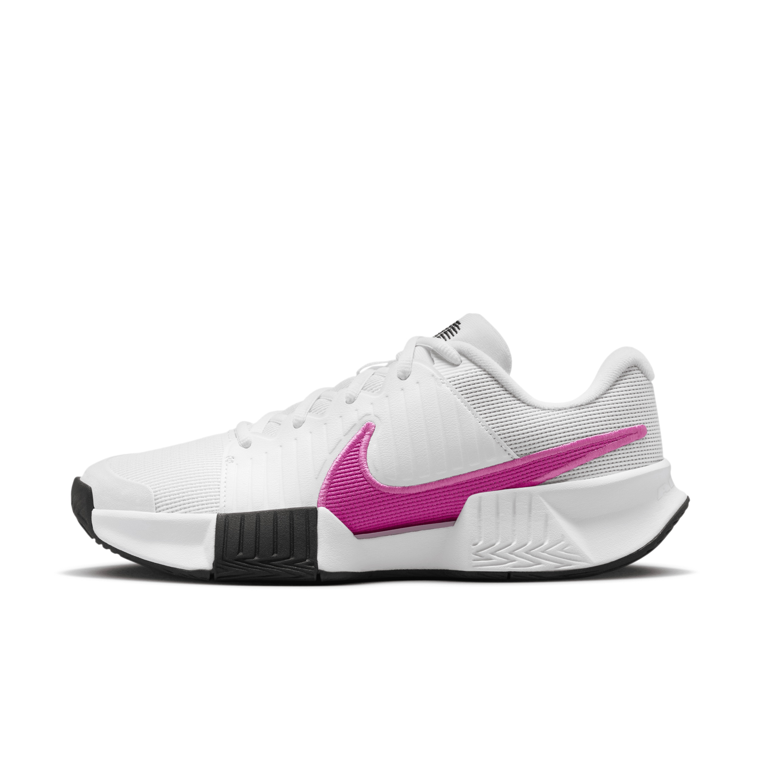 Game. Set. Match. Come out on the winning side in the all-new GP Challenge Pro. Designed for baseline back-and-forth bolts and dashes to the net, it has the needed speed and stability to help your game go the distance. Cut Quickly:A strong plastic midfoot plate combines with a wide base to offer stability for quick cuts and sudden changes in direction. Synthetic material around the lateral side helps keep your foot contained when moving side to side. Move Freely:Extra rubber in the toe area, specifically the big-toe side, adds durability where it's needed. High-abrasion rubber along the outsole offers durability and traction. Zoom, Zoom:A heel Air Zoom unit provides support to your step. Product Details:Designed for wear on hard court surfaces. Padded collar and tongue. Style: FB3146; Color: White/Black/Playful Pink; Size: 8.5; Gender: Female; Age Group: Adult | Nike GP Challenge Pro Women's Hard Court Tennis Shoes in White, Size: 8.5 | FB3146-108