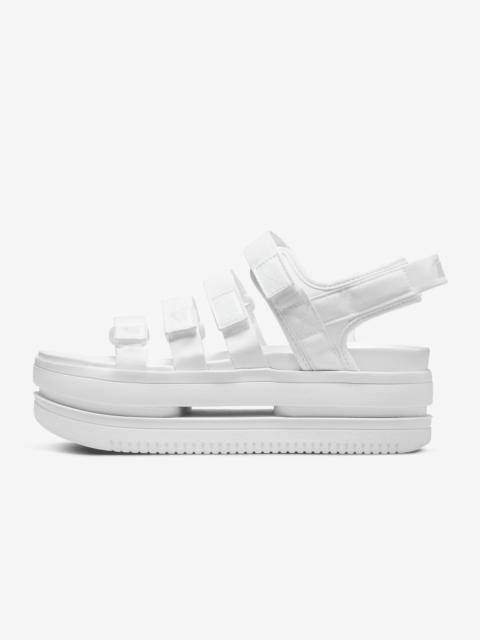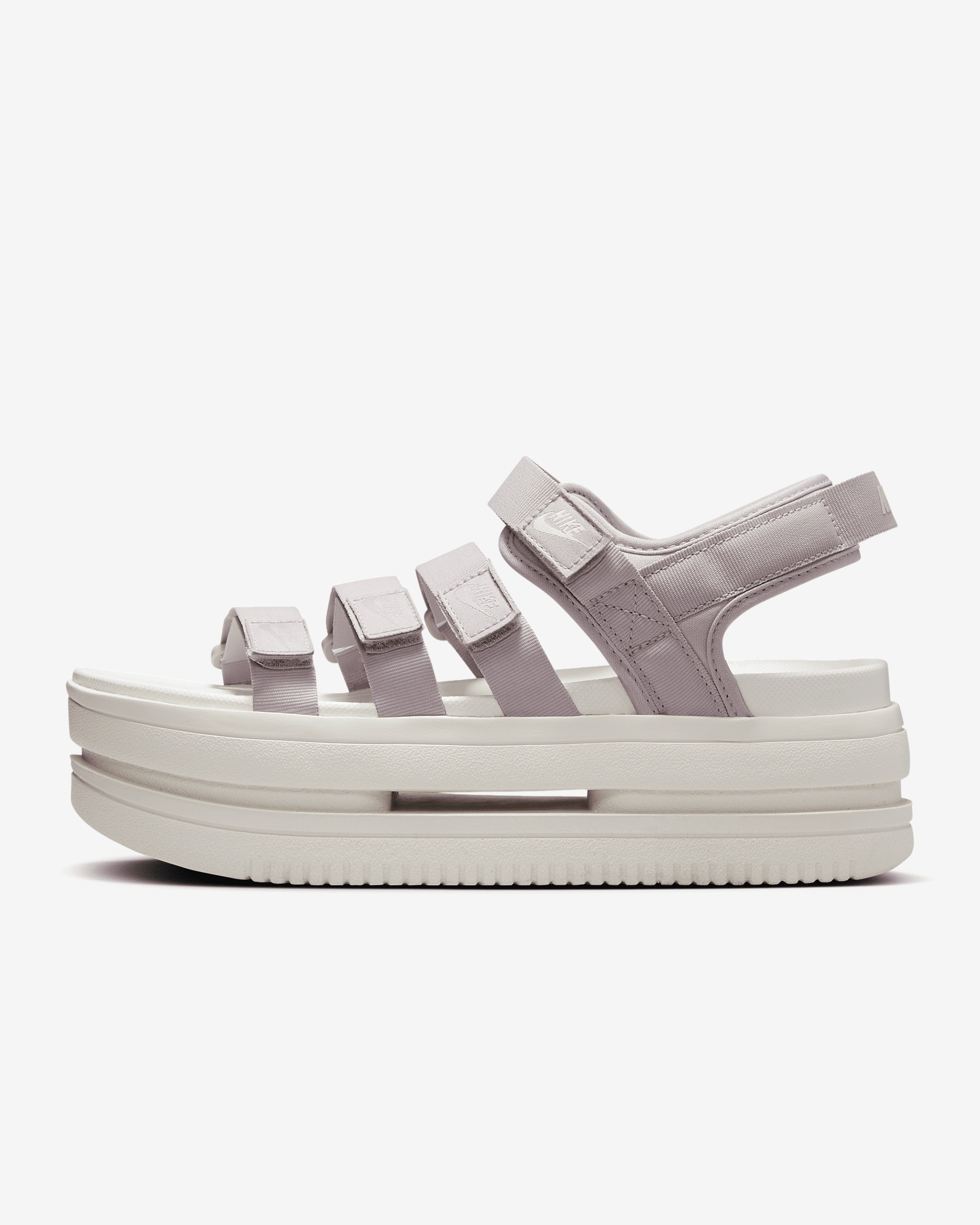 Lifted. Classic hoops detailing. Strappy but easy to wear. Check all the boxes in the Nike Icon Classic. Its big, bold midsole wows with comfort. The outsole pattern delivers iconic Air Force 1 vibes, while the multiple hook-and-loop straps add a fearless look. Get ready to shine with this new voice in sandal style. Benefits - Lifted midsole delivers the look you love with the comfort you expect. - Strappy upper features easy-to-adjust hook-and-loop closures that bring an innovative, fresh and fun look straight out of the box. - Classic Air Force 1 detailing on the outsole delivers heritage style, traction and durability. - Foam footbed adds to the comfort. Product Details - Forefoot height: 52mm. Heel height: 54.2mm - Shown: Platinum Violet/Sail/Sail - Style: DH0224-005 SIZE & FIT Fits small; we recommend ordering a fl size up