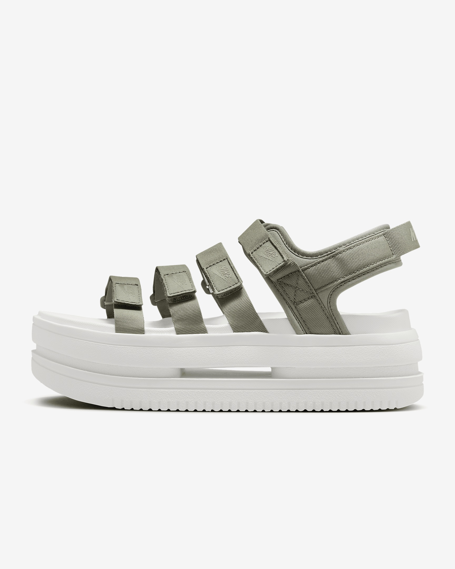 Lifted. Classic hoops detailing. Strappy but easy to wear. Check all the boxes in the Nike Icon Classic. Its big, bold midsole wows with comfort. The outsole pattern delivers iconic Air Force 1 vibes, while the multiple hook-and-loop straps add a fearless look. Get ready to shine with this new voice in sandal style. Benefits - Lifted midsole delivers the look you love with the comfort you expect. - Strappy upper features easy-to-adjust hook-and-loop closures that bring an innovative, fresh and fun look straight out of the box. - Classic Air Force 1 detailing on the outsole delivers heritage style, traction and durability. - Foam footbed adds to the comfort. Product Details - Forefoot height: 52mm. Heel height: 54.2mm - Shown: Light Army/Sail/Jade Horizon - Style: DH0224-301 SIZE & FIT Fits small; we recommend ordering a fl size up