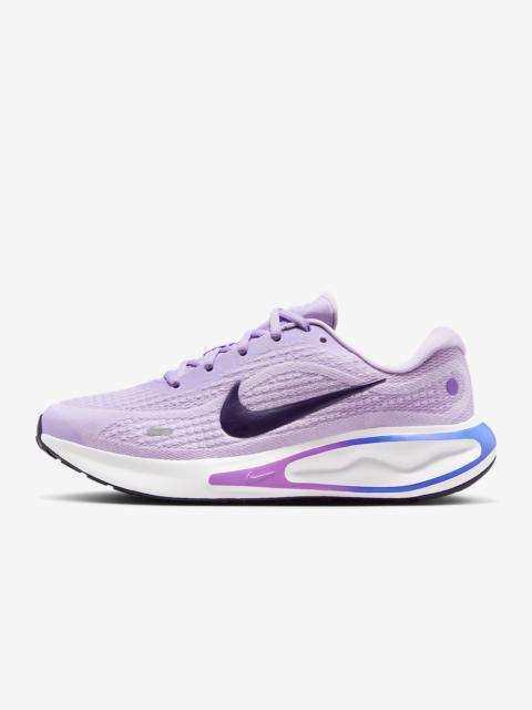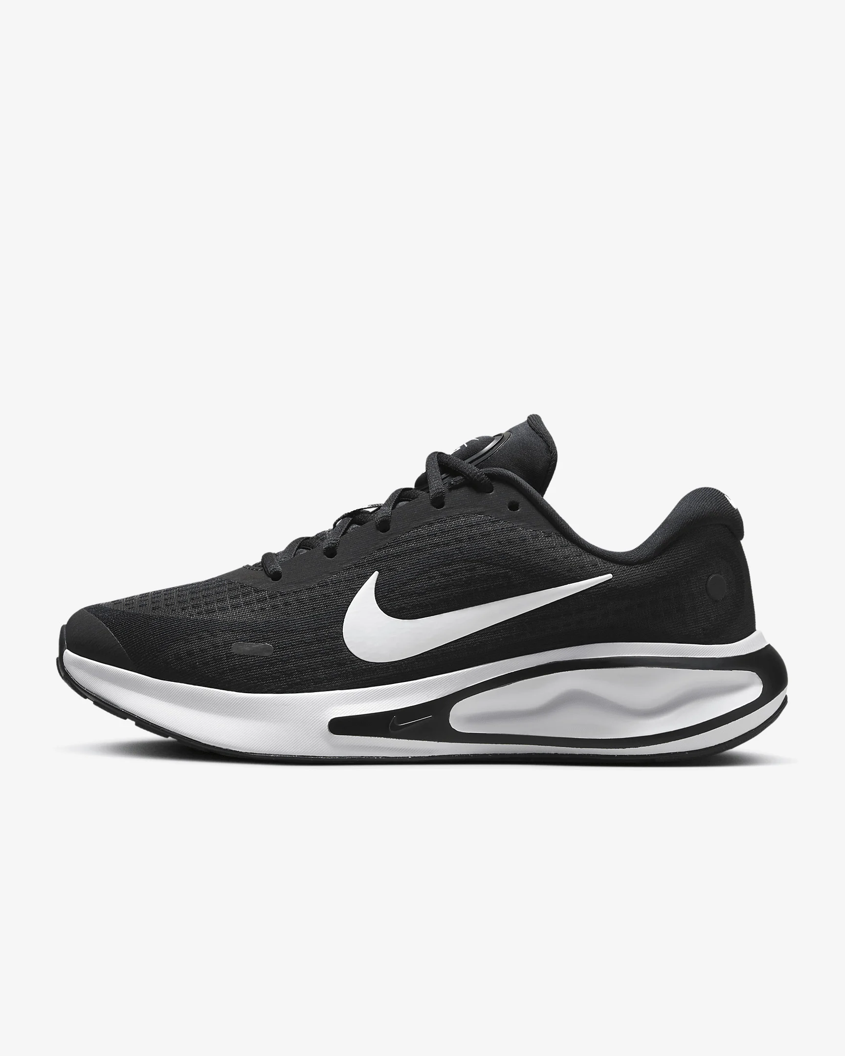 Enjoy every step, route and jaunt in the Nike Journey Run. It’ll have you striding and smiling on punishing pavements, thanks to extra-high foam stacks and supersoft cushioning. It's so comfy that you'll already be looking forward to lacing 'em up again. Benefits - Engineered mesh helps your feet feel secure. - Extra cushioning in the heel and soft touch points in the tongue and collar add comfort. - Rubber outsole provides traction for your miles. Product Details - Reflective details - Not intended for use as Personal Protective Equipment (PPE) - Shown: Black/White - Style: FJ7765-001