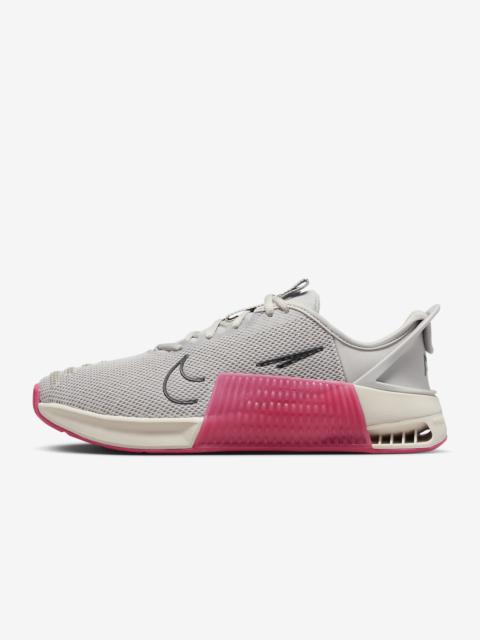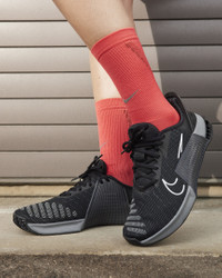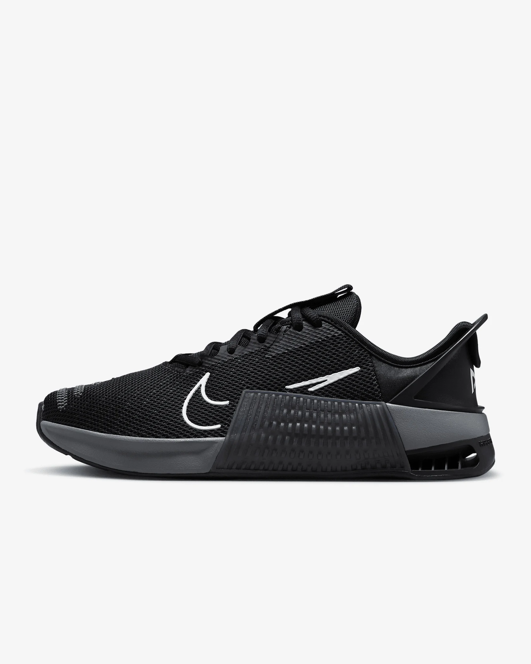 Whatever your "why" is for working out, the Metcon 9 makes it all worth it. We improved on the 8 with a larger Hyperlift plate and added rubber rope wrap. Sworn by some of the greatest athletes in the world, intended for lifters, cross trainers, go-getters and it’s still the gold standard that delivers day after day. This version has Nike EasyOn technology—the flexible heel collapses when you step in then snaps back into place—to help make them easy to put on and take off. More Benefits - Full rubber outsole provides durable traction for dynamic movements like cleans and walking lunges. - Breathable textile has a haptic print, which creates a 3-D effect that adds durability and texture, helping make it easier to keep your shoes clean. Also, it sports flexible, durable support in the toe area, so that when your toes splay when lifting heavy weights, it won’t feel restrictive. Product Details - Shown: Black/Anthracite/Smoke Grey/White - Style: DZ2540-001
