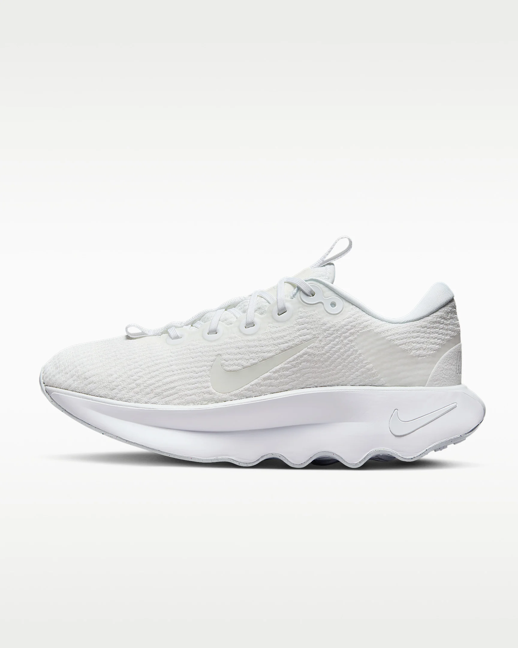 Designed for walking in ultimate comfort, the Nike Motiva provides our highest level of cushioning. A tall foam stack combines with our Comfortgroove innovation on the outsole to absorb the bumps along the way. And its exaggerated rocker helps propel you forward. Benefits - Super-high cushioning - Moderate stability - Moderate flexibility Product Details - Soft foam collar - Widened forefoot, arch and toe box - Durable outsole pattern for traction - Reflective details - Not intended for use as Personal Protective Equipment (PPE) - Shown: White/Summit White/Pure Platinum/White - Style: DV1238-106 SIZE & FIT Fits small; we recommend ordering a half size up