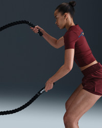 Nike One works for it all. This top's midweight, peachy-soft fabric stretches with you and dries quickly. An opening at the back helps keep you cool. Benefits - Nike Dri-FIT technology moves sweat away from your skin for quicker evaporation, helping you stay dry and comfortable. - Taping adds definition and contrast. Product Details - 80% polyester/20% spandex - Reflective Swoosh logo at center back - Not intended for use as Personal Protective Equipment (PPE) - Machine wash - Imported - Shown: Dark Team Red/Armory Navy/Black - Style: HM9637-619 SIZE & FIT Model is wearing size S and is 5′9″175cm Tight fit: snug and form-fitting