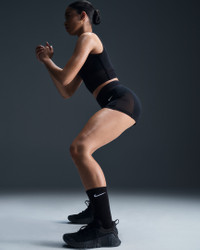 Don't be afraid to turn up the heat on your workout—these shorts are made with moisture-wicking tech and open-hole mesh panels to help keep things breezy. Smooth, stretchy fabric helps you stay comfortable through every squat and lunge. Benefits - Nike Dri-FIT technology moves sweat away from your skin for quicker evaporation, helping you stay dry and comfortable. - Mesh elastic waistband sits snugly against your skin without pinching or binding. Product Details - Body: 78% polyester/22% spandex. Panels: 81% polyester/19% spandex. Waistband: 92% nylon/8% spandex. - Machine wash - Imported - Shown: Black/White - Style: FN3336-010 SIZE & FIT Tight fit: snug and form-fitting Medium support: feels ke a snug hold to keep everything in place Mid-Rise: sits just below your natural waist (smallest part of your torso)