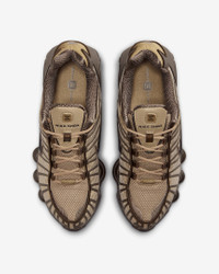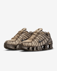 The Nike Shox TL takes mechanical cushioning to the next level. A recrafted version of the 2003 icon, it features breathable mesh in the upper and full-length Nike Shox technology for optimal impact absorption and a bold look on the streets. Benefits - Nike Shox technology combines resilient, flexible columns with moderator plates for outstanding cushioning that compresses and regains its shape. - Design is a near-exact replica of the 2003 Nike Shox TL. - Molded overlays throughout the midfoot provide support and a snug fit. - TPU plate in the heel supplies lateral stability and support. Product Details - Synthetic and textile upper - Rubber outsole - Not intended for use as Personal Protective Equipment (PPE) - Shown: Khaki/Ironstone/Off Noir - Style: AR3566-201